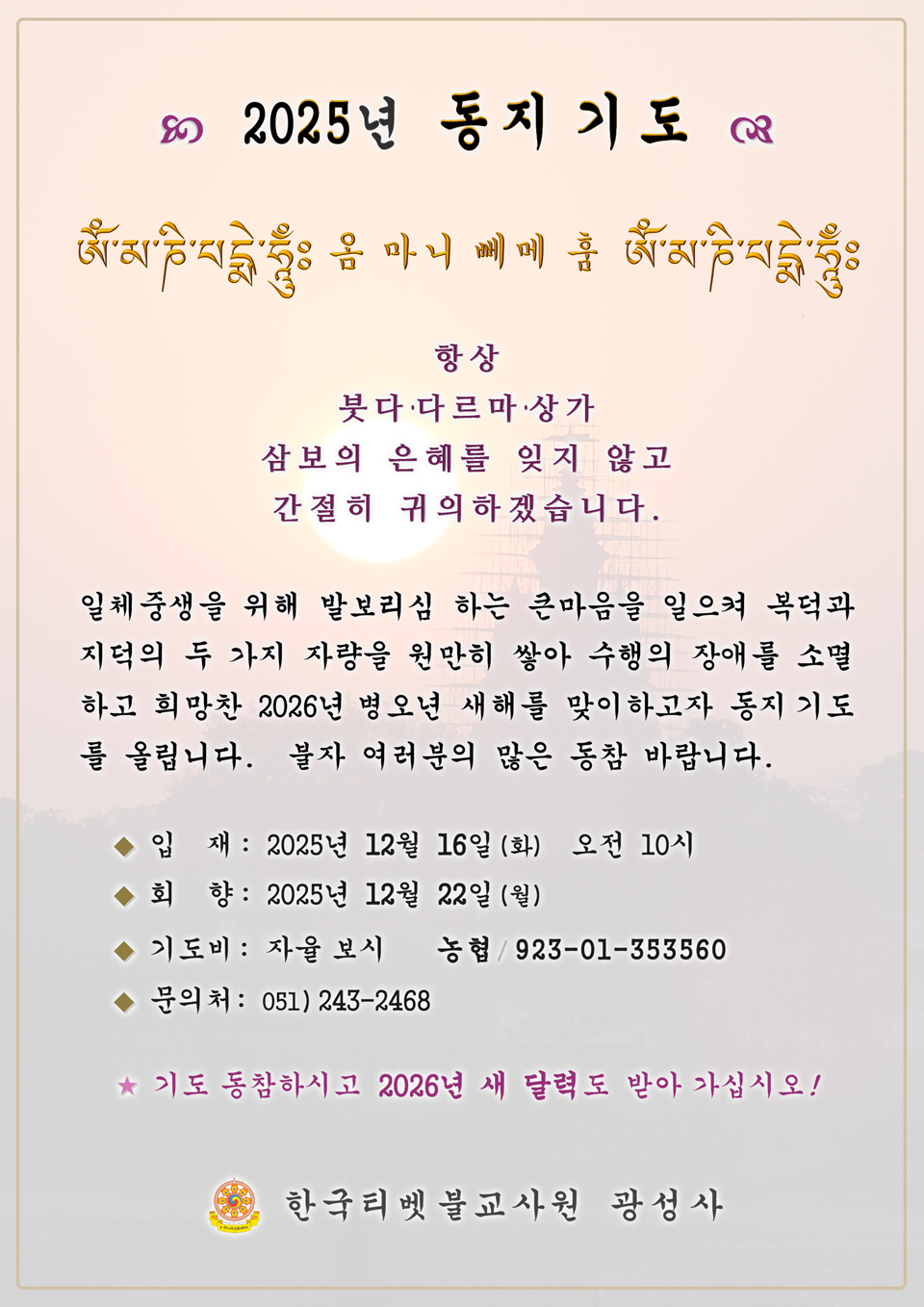 희망찬 2025년 병오년 새해를 맞이하고자 12월 16일부터 7일간 동지 기도를 올리고자 합니다.