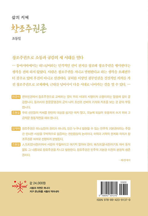 창조주권이란 “창조하는 본성을 타고난 주체가 스스로 창조하는 권한이자 능력”을 말한다. 저자는, 천인합일의 동아시아 기학氣學(최한기)에 바탕한 창조주권이 신과 인간 사이의 차등을 전제로 한 서구의 천부인권과 대조됨을 보인다. 이로써 유럽문명의 자연법 관념을 전복시키며, 정치주권(국민주권), 시민의식을 창조주권과 비교하여 창조주권론으로 탈근대의 개벽을 선언한다.
