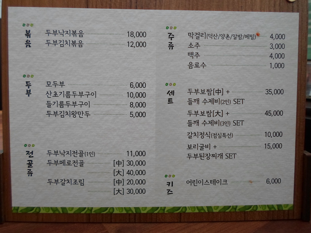 5. 음식 값 : 두부된장찌개 7,000원, 콩비지찌개 7,000원, 두부보쌈수육(중) 25,000원, 두부보쌈수육(중)+들깨수제비(2인) 35,000원, 두부낙지전골 1인 11,000원, 훈제오리보쌈(중) 25,000원 등등