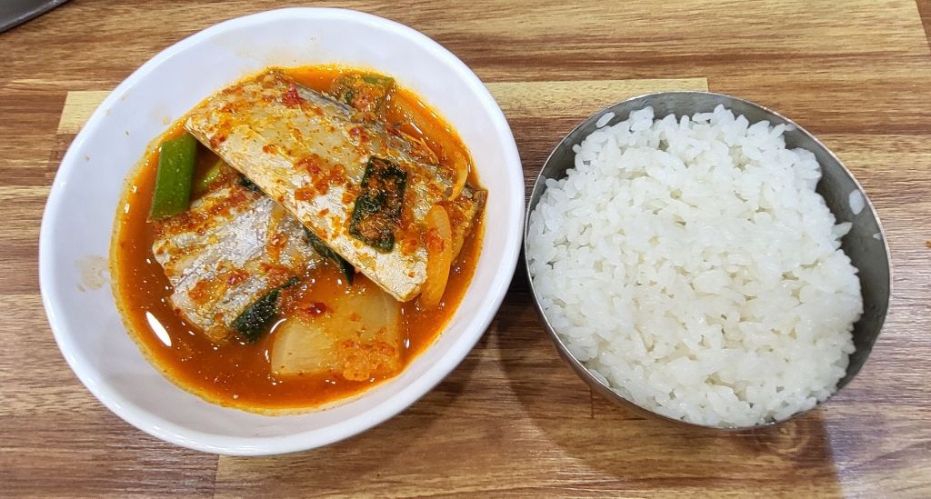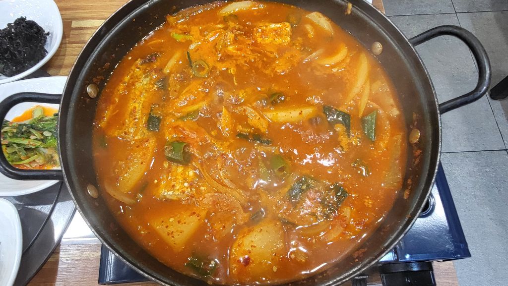 갈치조림. 무와 졸였다. 개운하고 푸짐하다. 간혹 설탕을 넣은 집들도 있는데, 무와 갈치로만 맛을 내서 무맛도 갈치 맛도 이의 조합맛도 개운하다. 고춧가루도 많이 맵지 않다. 편하게 개운하게 먹을 수 있다. 전통의 맛이 그대로 느껴진다. 갈치도 제법 두툼하여 오진 밥상 받은 거 같다.