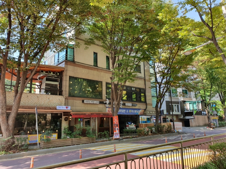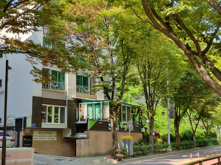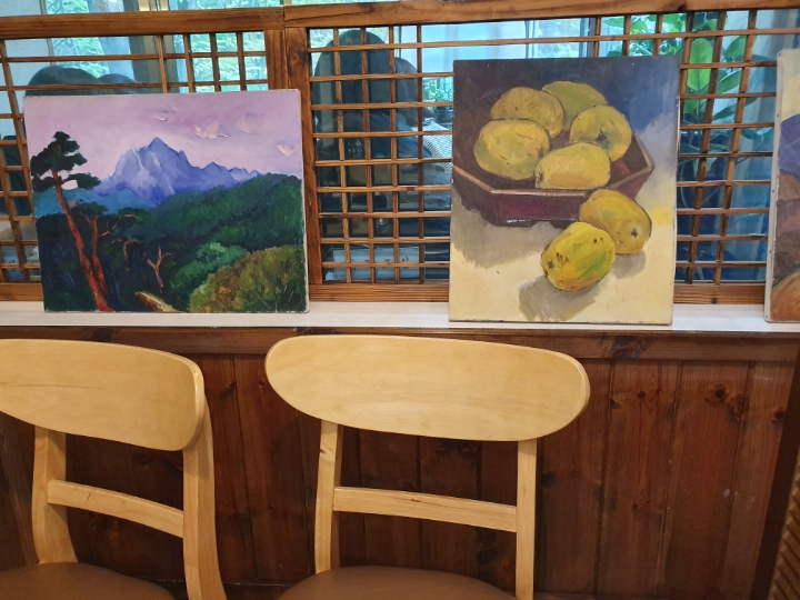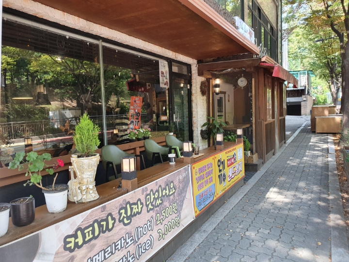 음식점 옆집은 커피집이다. 커피맛이 최고는 아니어도 최고로 저렴하기는 한다. 5천원이면 두 잔이 가능하다. 거기다 공기 좋고 시끄럽지 않은 산책길을 끼고 있어고 맞은편은 근린공원이라 유럽식 실외 커피가 가능하다. 어지간히 추운 날씨라도 햇빛만 있으면 오돌오돌 떨면서도 나와 앉아 간단 음식과 커피를 즐기는 테라스문화, 사실 우리는 햇빛이 궁하지 않아 그런 문화 필요없지만 그냥 분위기 내보고 싶으면 이집이 제격이다.