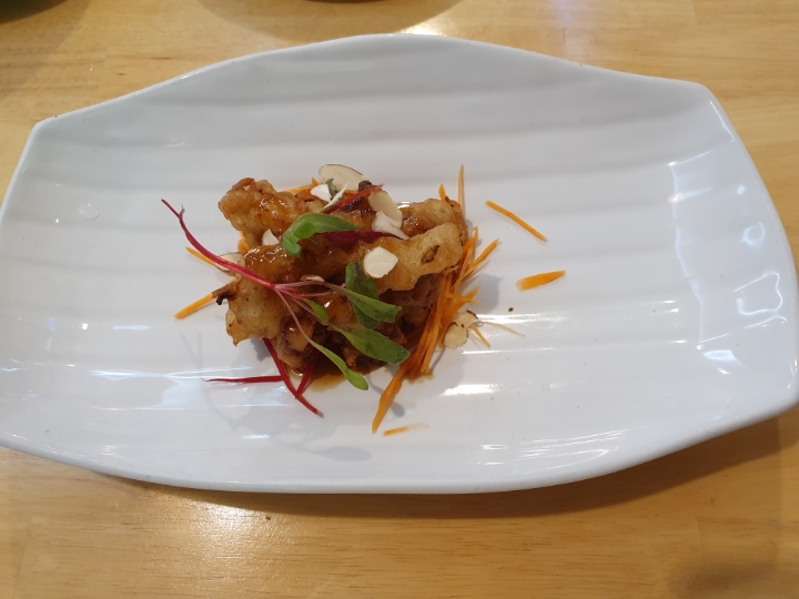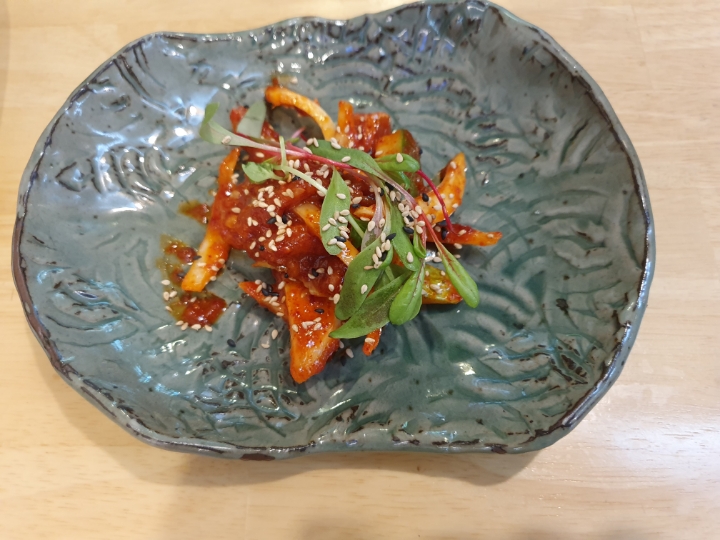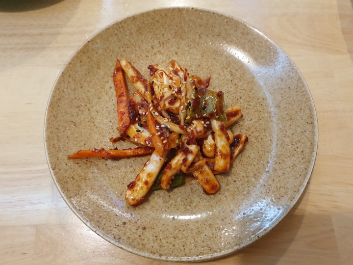 오징어볶음. 오징어는 자칫 물이 나서 볶음이 걸죽해지고 모양새가 나지 않기 쉬운데, 맛도 모양도 다 잡았다. 아마도 먼저 삶아 살짝 볶아낸 듯하다. 쫄깃한 육질이 오징어볶음 최고의 맛이다.