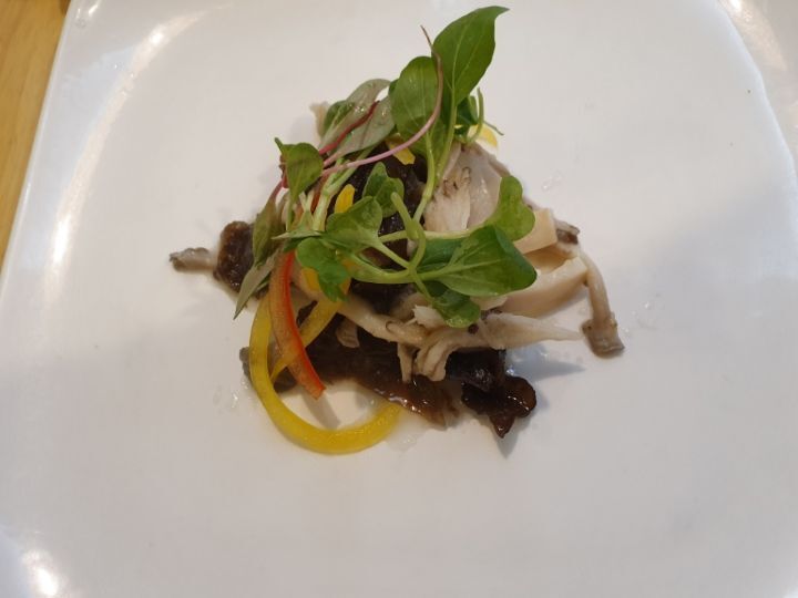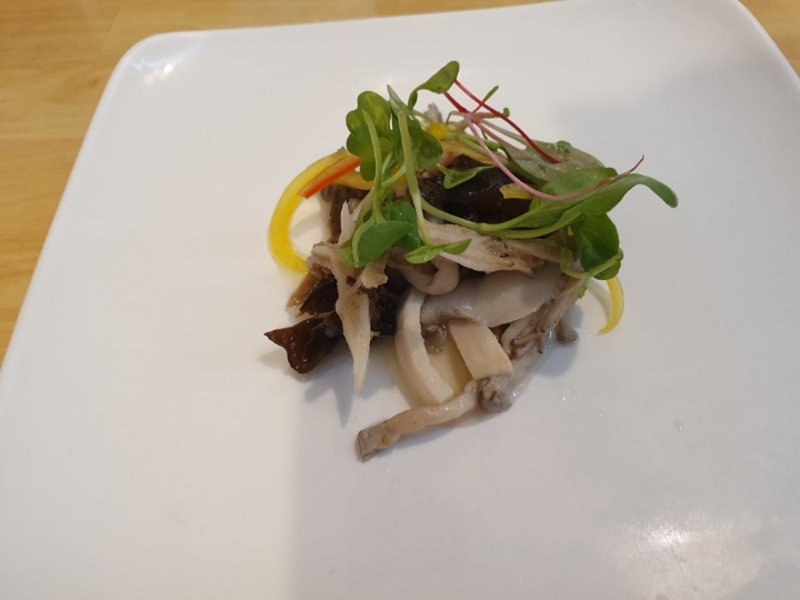 버섯무침. 초무침으로 해서 신선한 발상이 좋다. 초맛이 진하지 않아 결이 잘 살아 있는 버섯의 향취와 모양새를 그대로 살렸다.