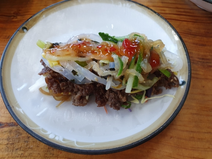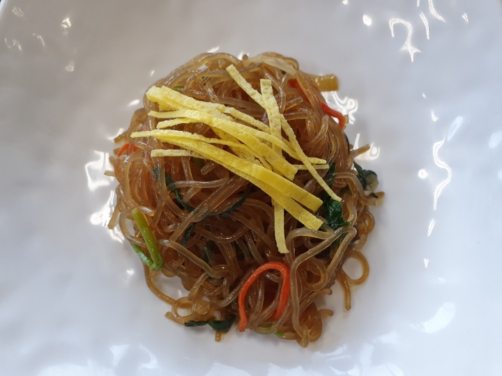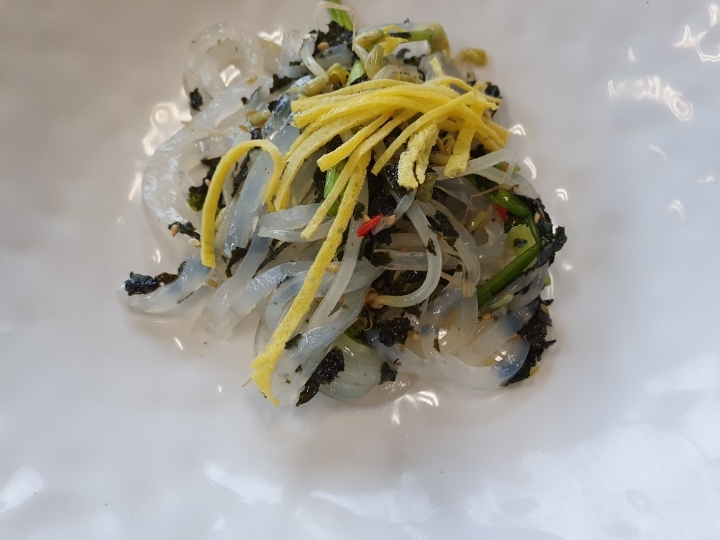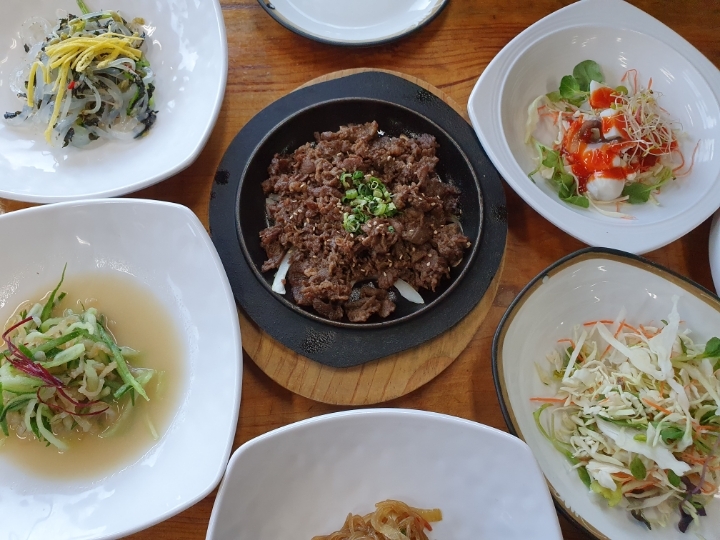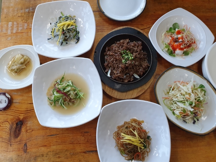 오징어초무침, 탕평채, 해파리냉채, 잡채에다 불고기다. 그리고 묵은백김치와 야채모듬이 속으로 나와 서로 궁합이 잘 맞는다.