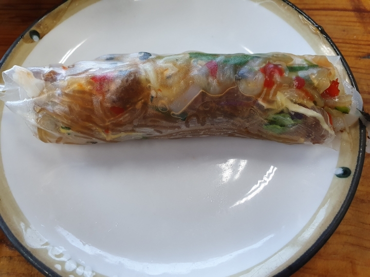 여러 재료를 넣고 싸보았다. 어지간한 솜씨로도 옆구리 터트리지 않고 쌀 수 있다. 미지에 있는 타피오카 성분 때문이다. 미지, 라이스페이퍼는 대개 쌀 20%, 타피오카 80%, 혹은 그 반대 비율로 만들어진다. 타피오카가 주재료면 더 쫄깃하고 잘 안 터진다. 쫀득한 맛이 바로 여기서 나온다.