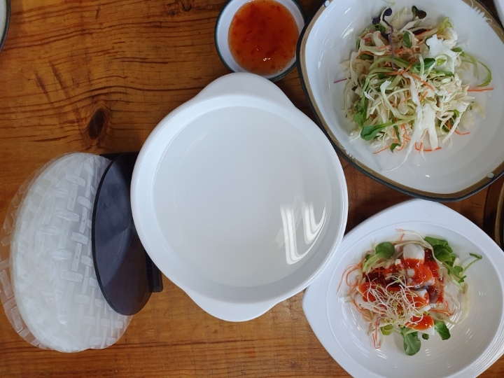 먼저 한식 찬들, 쌈을 할 속으로 넣을 수 있는 7종류의 찬과 라이스페이퍼다. 식재료가 아닌 완성된 형태의 음식을 속으로 사용하여 라이스페이퍼에 싸먹는다. 속은 한식, 거죽은 월남식이다.