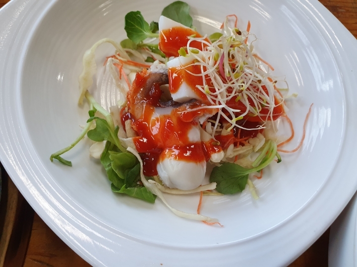 이 쫄깃거리는 미지에 부드러운 반찬들을 싸고 야채를 곁들여 월남 소스를 조금만 쳐 먹으면 와, 상큼하고 풍부한 맛에 혀와 배가 행복하다. 미지는 속을 확실하게 잘 섞어 준다. 맛이 한층 비상한다.