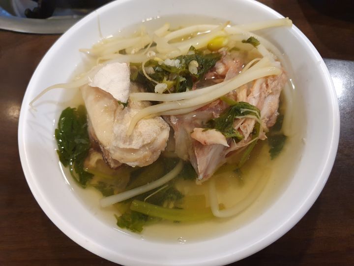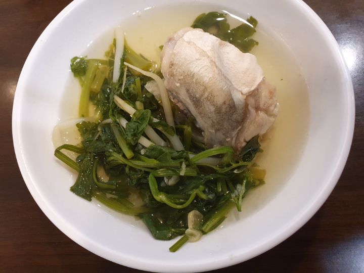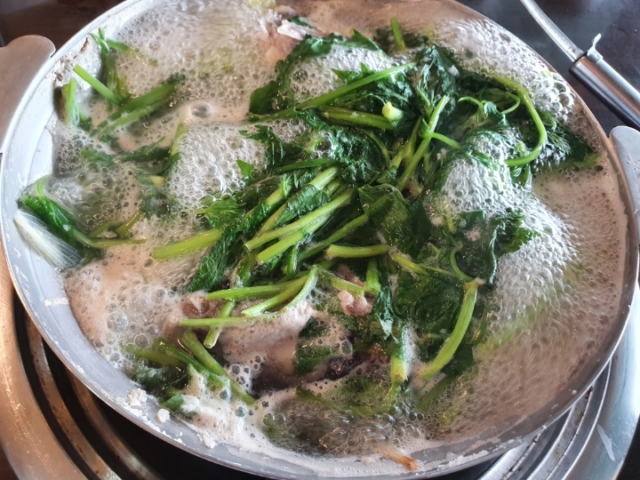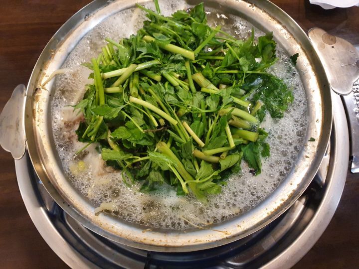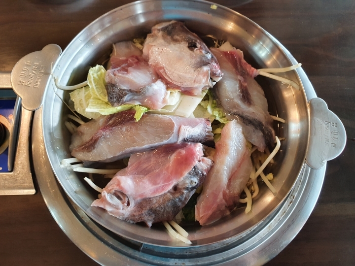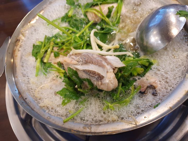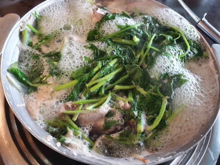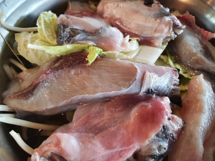 우선 생물이 아니어서 끓이기 전의 상태를 공개할 수 없다. 더구나요즘 코로나여서 많은 손님을 보장하기 어렵다. 찌개는 우선 많은 콩나물을 깔고 위에 몇 덩이 고기 토막을 넣고 미나리를 넣는다. 먹어보니 냉동복어가 채 해동이 되지 않은 상태에서 넣은 거 같았다. 고기가 퍽퍽하고 맛이 안 난다. 하지만 국물은 시원하고 좋다. 육수를 따로 끓여 맛을 낸 상태에서 복어를 곁들이는 느낌으로 넣는다는 느낌이다.