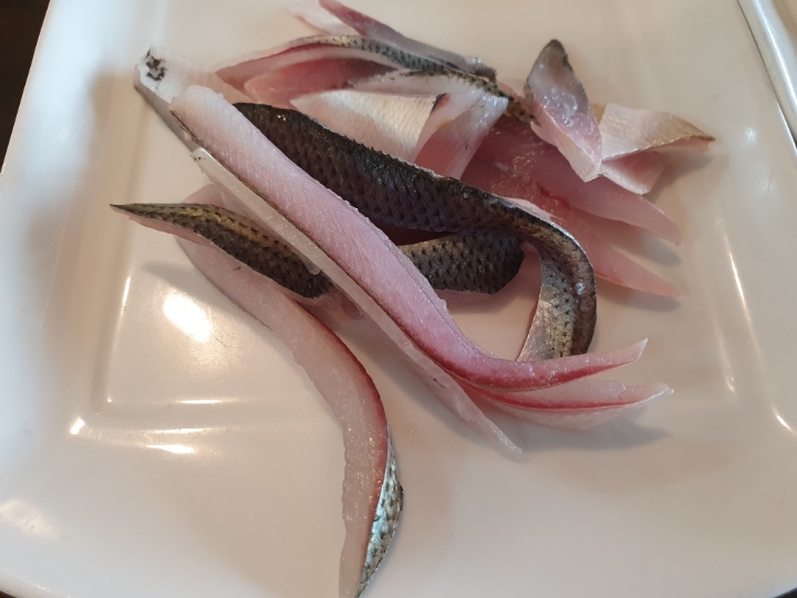 빨간고기, 열기다. 튀겨서 나왔다. 신선한 맛이 그대로 담겼다. 간도 적당해서 식감이 좋다.