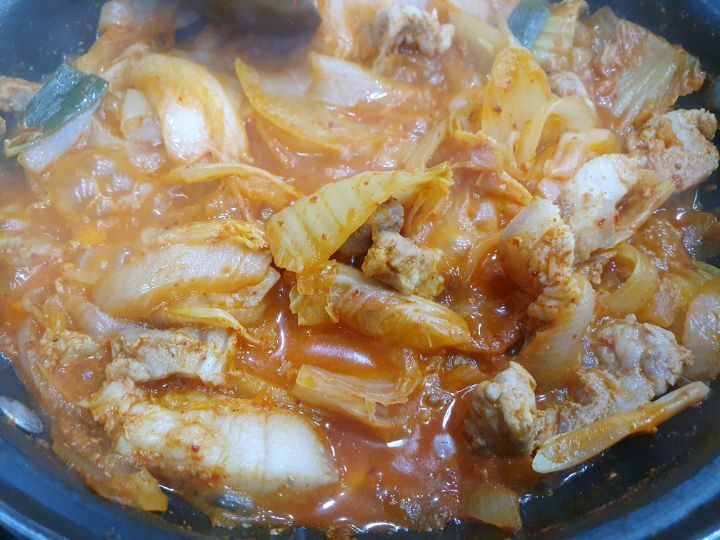 듬뿍 넣는 양파는 또 다른 비결이다. 김치는 그리 시지 않고 살짝 익었다. 양은 둘이 싹 비울 수 있을 만큼이다. 부족하다 생각되면, 두부와 라면사리를 추가하여 다양한 맛과 영양, 그리고 양을 다 잡을 수 있다.