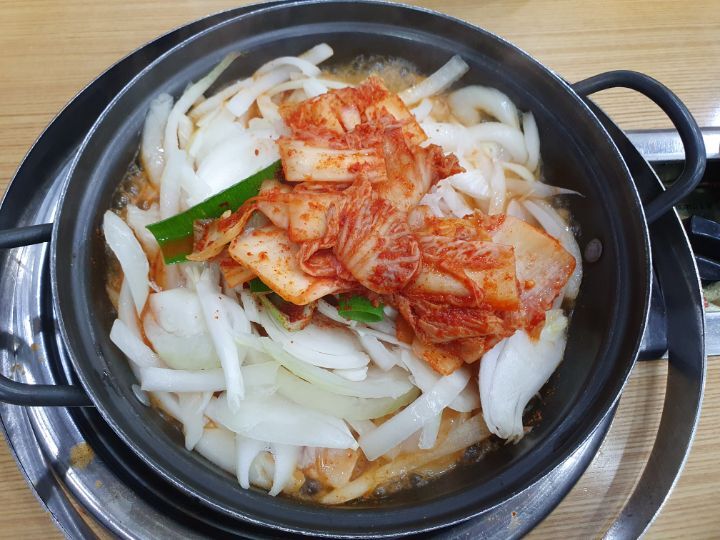 차려진 찬은 아주 간소하다. 가져온 김치는 그 자리에서 찌개에 집어 넣는다. 김치를 따로 먹을 일이 없다. 김치는 찌개를 위한 찬이다.
