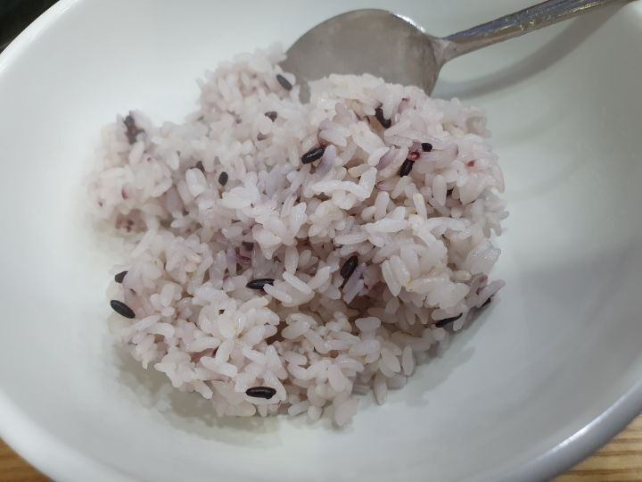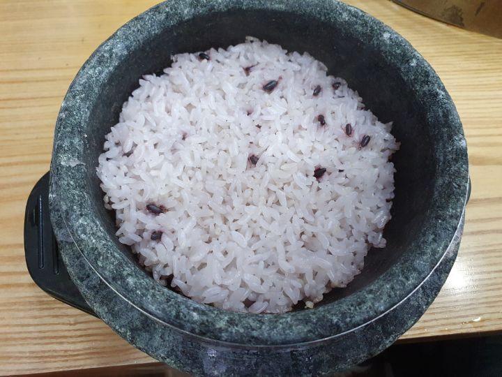 거친밥이 아닌 부드러운 밥과의 대응이 요새는 흰쌀밥에 잡곡밥, 혹은 현미밥으로 이루어진다. 잡곡밥이든 현미밥이든 공통적으로 추구하는 것은 차지고 윤기나는 것이다. 이 돌솥밥의 푸르스름한 보라색은 아마도 흑미류의 잡곡에서 나왔을 터, 건강과 식감을 다 잡으려 한 노력이 담긴 밥인 셈이다. 덕분에 식감은 물론 심리적인 식감도 같이 잡아 밥맛을 높이고 음식의 격을 높인다.