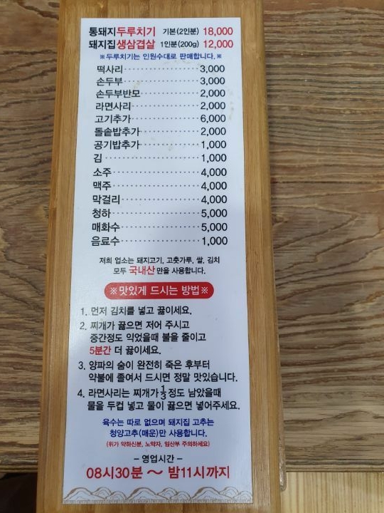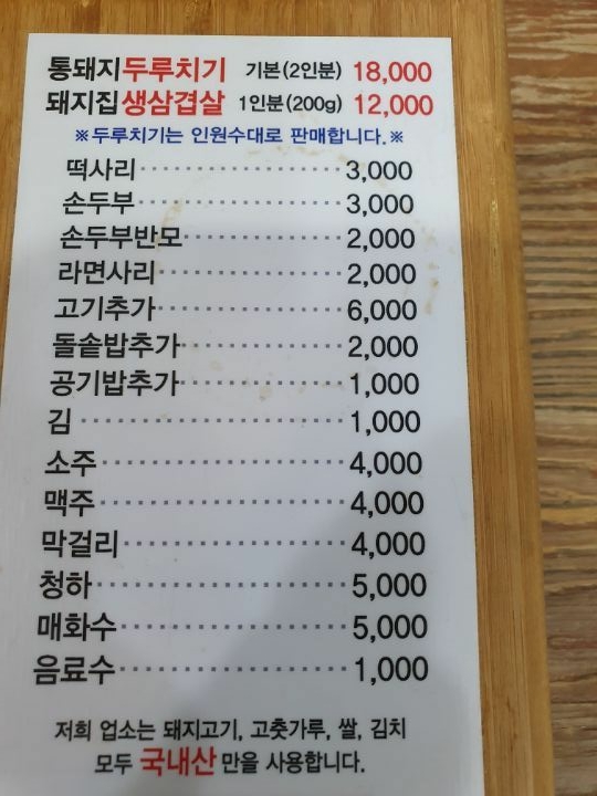 먹은음식 : 통돼지두루치기 2인분 18,000원(1인분 주문불가)