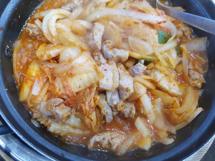 보글보글 한참 끓인다. 돼지고기는 너무 오래 끓이면 맛없다. 이 음식의 핵심은 돼지고기다. 맛있는 돼지고기 확보가 맛의 1등공신이다. 돼지고기가 비계부위도 느끼하지 않고 고소하다.