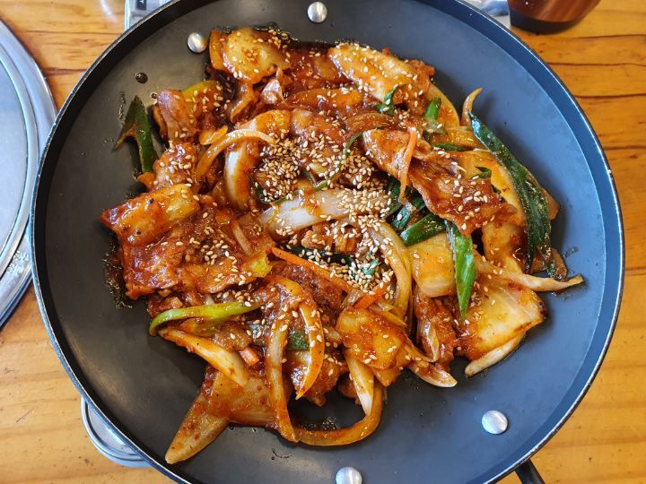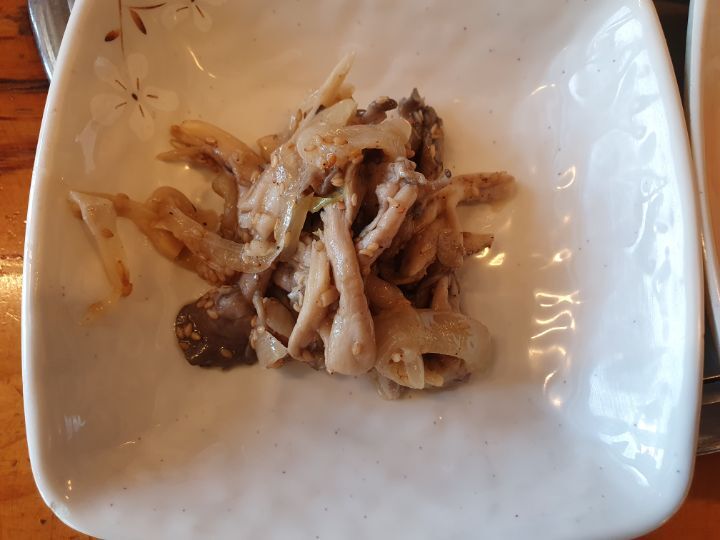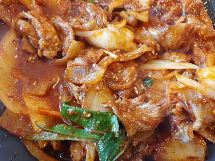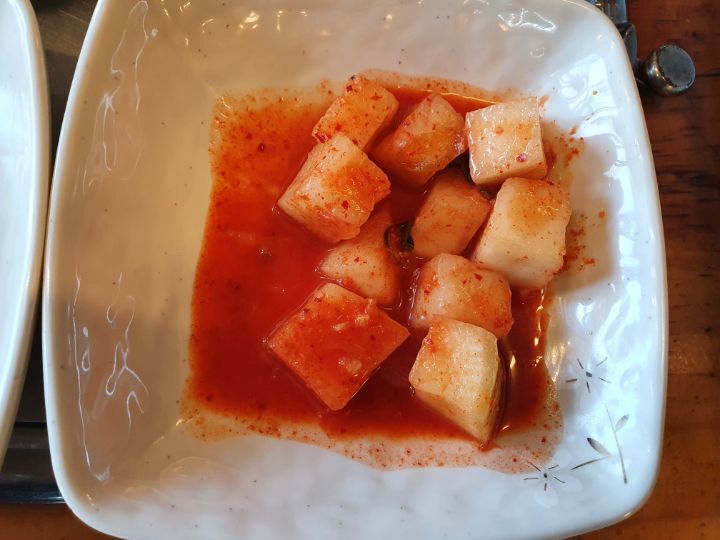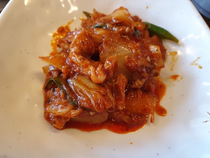 돼지고기는 한국산,김치는 중국산이다. 고기가 쫀득거리고, 양념이 제법 진한데, 김치 덕에 느끼하지 않다.