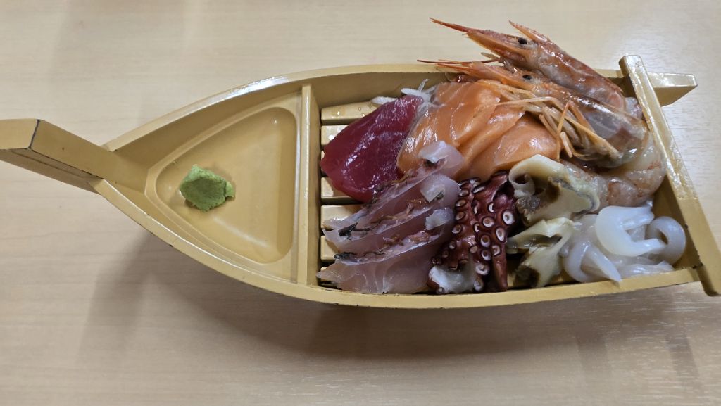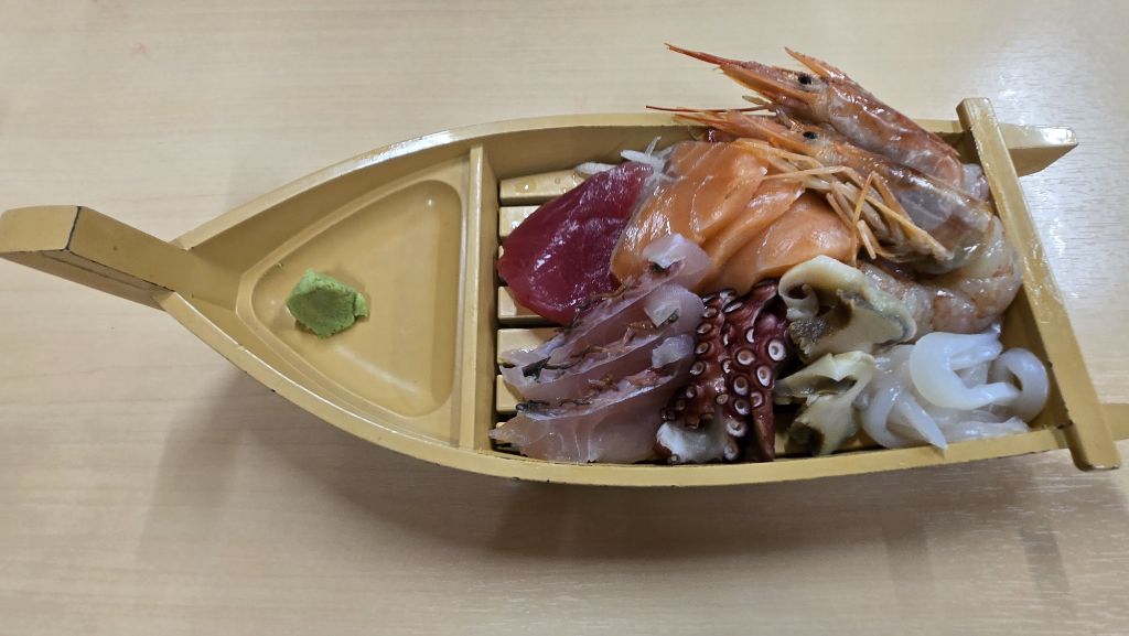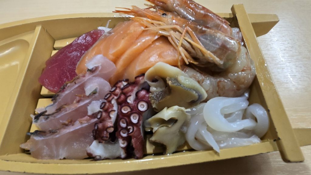 따로 주문한 생선회. 참치에 민어? 연어, 문어, 소라, 오징어, 새우 등이 나왔다. 종류는 우리와 비슷한데 맛은 많이 다르다. 특히 새우, 우리는 하얗고 맛도 개운한 느낌을 주는데 이 새우는 반투명에 누르스름, 거기에 맛도 좀 기르진 느낌.