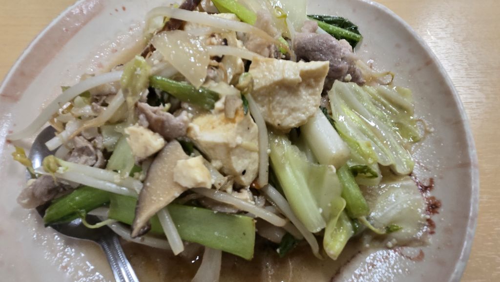 숙, 배추, 두부, 버섯, 돼지고기 등을 넣고 볶았다. 이름은 야채볶음인데 돼지고기가 많이 들어 있다. 여기도 콩나물이 아닌 숙주문화권, 두부의 용도가 매우 일본본토보다 다양하다. 볶음 품새는 중국을 닮았다. 돼지고기를 많이 쓰는 것은 유구음식의 대표적인 특색이다. 일본은 1200년간 육식 금지역사 덕분에 돼지고기 요리가 별로 발달하지 않았다. 음식문화만 봐도 일본과 그 계통을 달리함을 알 수 있다.