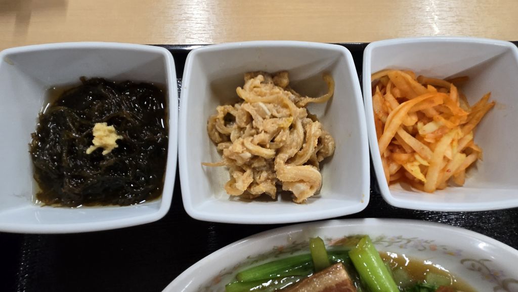 톳?, 돼지귀요리?, 생채. 곁반찬이 일식보다 풍성하고 다양하다.