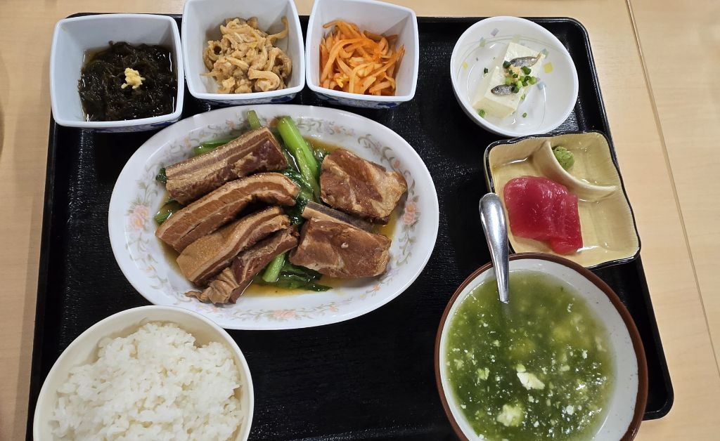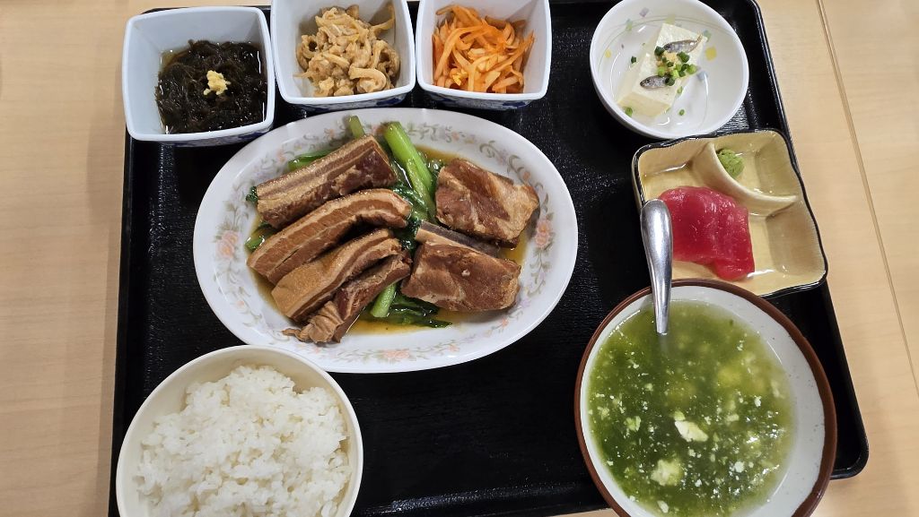 오키나와 정식의 돼지고기, 갈비살이 주로 나왔다. 돼지고기삼겹살 장조림. 아래는 얼갈이 정도 되는 매추를 깔았다. 얼핏 보면 중국 동파육 같은 느낌이 나지만 맛은 전혀 다르다. 달지 않고 끈적거리는 느낌없이 오히려 담백한 느낌이다. 많이 짜지 않은 장조림 느낌.