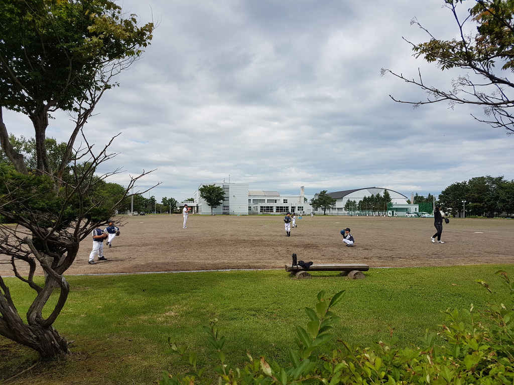 8월 19일 지금 시각. 시레토코샤리소학교 아이들. 맑은 8월 하늘 아래 야구 연습을 하고 있다. 일요일인데도 교사도 아이도 연습에 열심이다. 일본 야구가 왜 센지 알수 있다.
