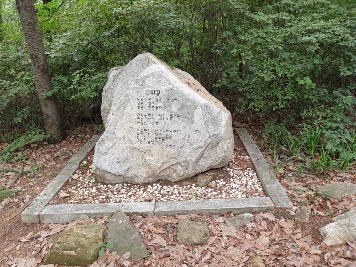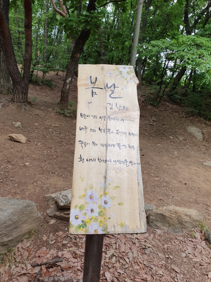 좋은 시들을 양편에 두고서 올라갈 수 있다. 팻말에 써놓은 시들은 부담이 없으나 큰 돌에 새긴 시는 부담이다. 중국 태산에 갔을 때 보았던 그 많은 유명 시인과 시들, 아무리 소식, 소동파의 시라도 바위에 새겨져 영원히 남는 것은 누군가에게는 부담일 수도 있다는 생각이다. 무엇이든 영원하고 보편적인 것은 없다. 나도 좋은 시도, 뛰어난 시인도 누군가와 함께 우리 속 하나일 뿐이지 않을까.
