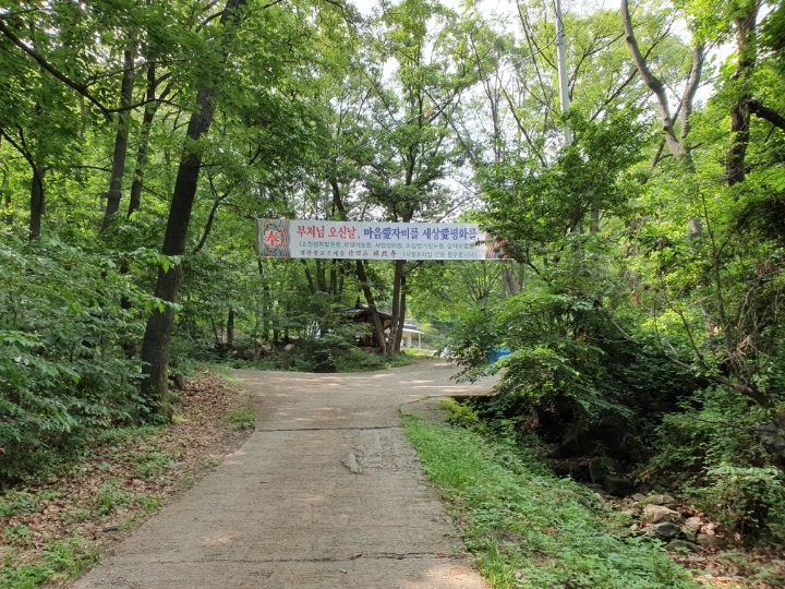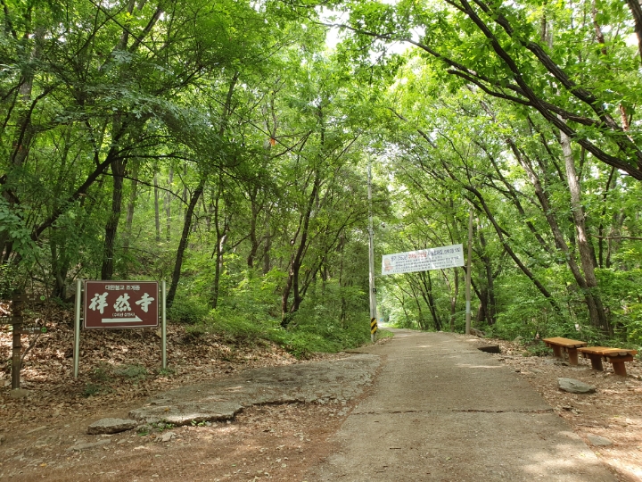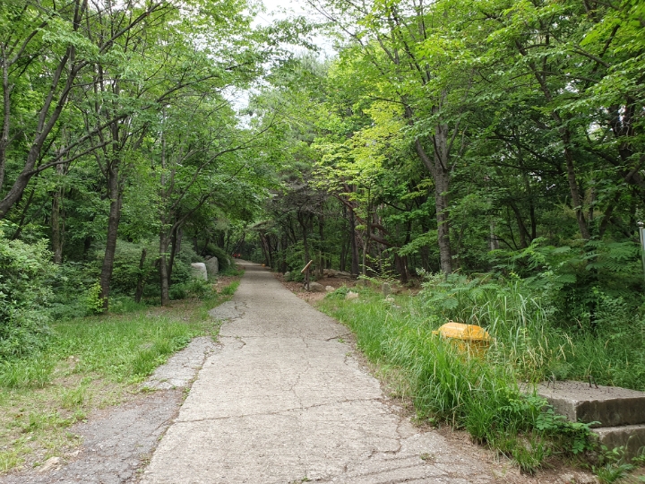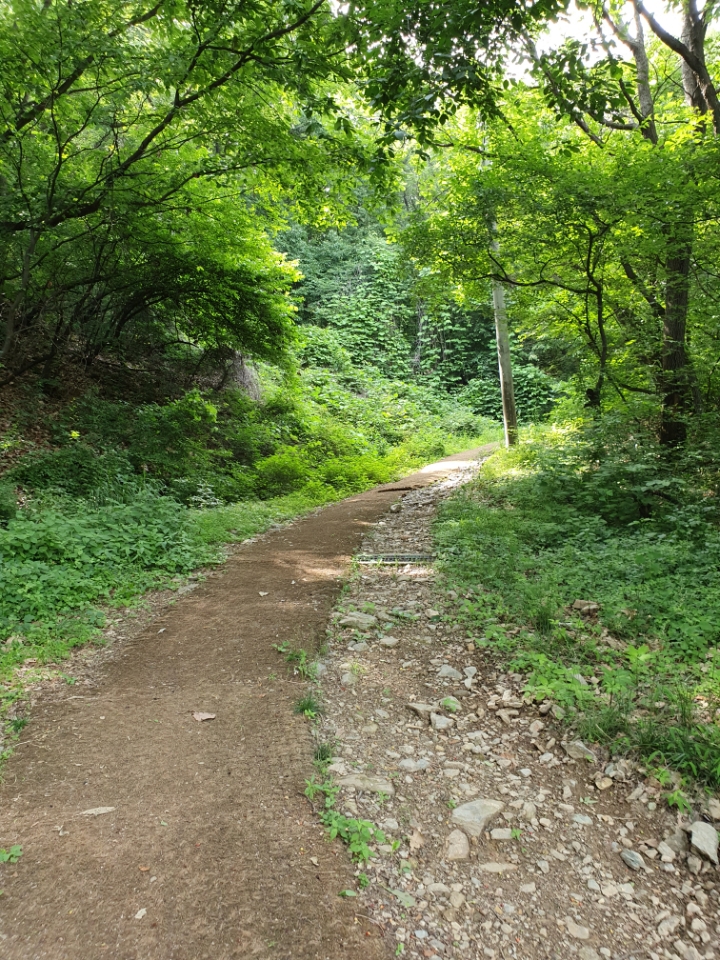 상연사를 지나니 이제 흙길이다. 상연사 바로 아래 왼쪽으로 오르는 길을 따르면 흙길과 멍석이 깔린 길로 이어진다. 숲 사이로 난 길이어서 햇빛과 그늘과 초록이 다 있다.