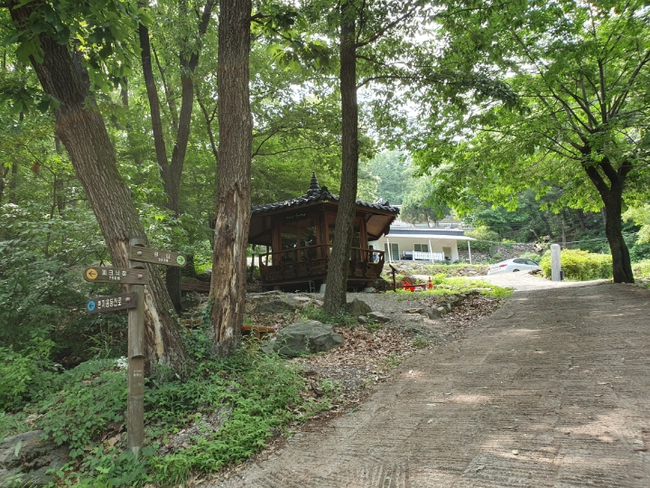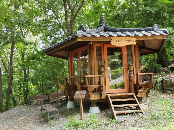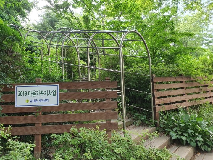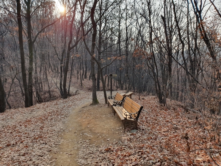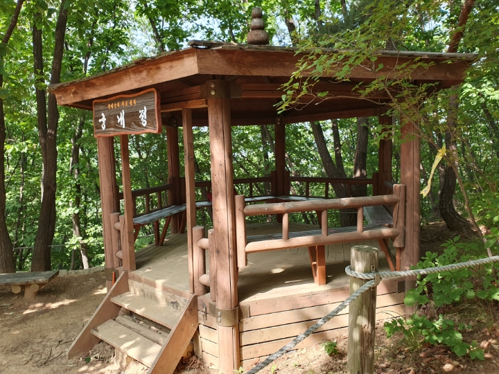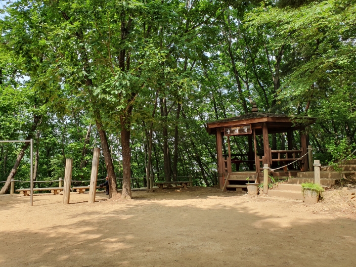 작은 정자도 있다. 이름도 궁내정, 아랫동네 이름이 정자 이름이 되었다. 여러 운동 시설은 자주 오르는 분들이 설치하고 관리도 하는 거 같다. 손때, 사람 냄새가 가득하다. 작은 운동장?을 빌어 막운동도 하고, 벤치에 앉아 물도 마시고, 그러고 이 정자를 끼고 오르는 듯한 내리막길로 접어들며 둘레길 산책이 절반은 끝난다.