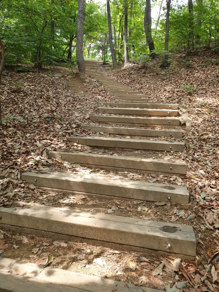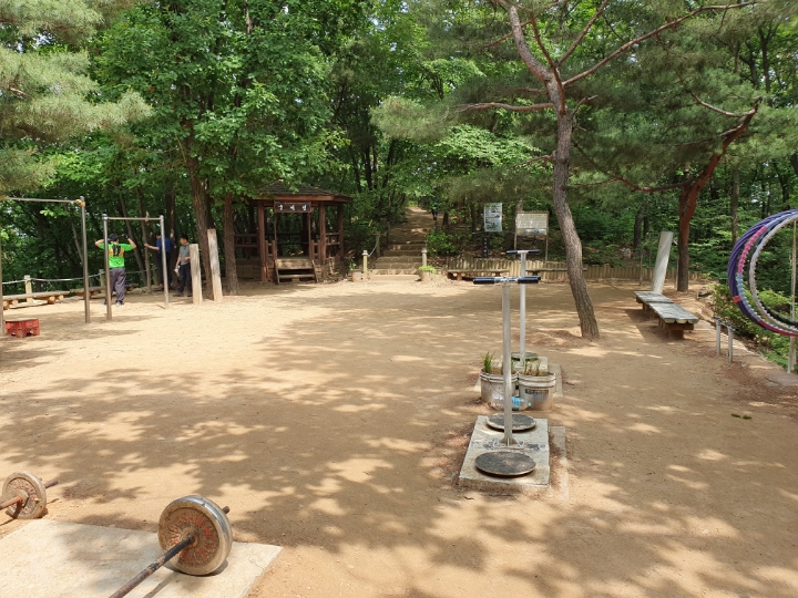 조금 오르면 나무계단이 보인다. 나무계단을 올라오면 평지, 휴식과 운동 공간이 나온다.