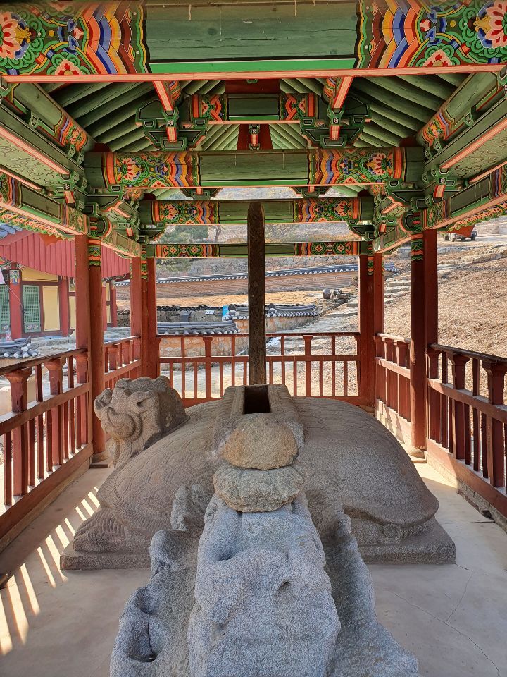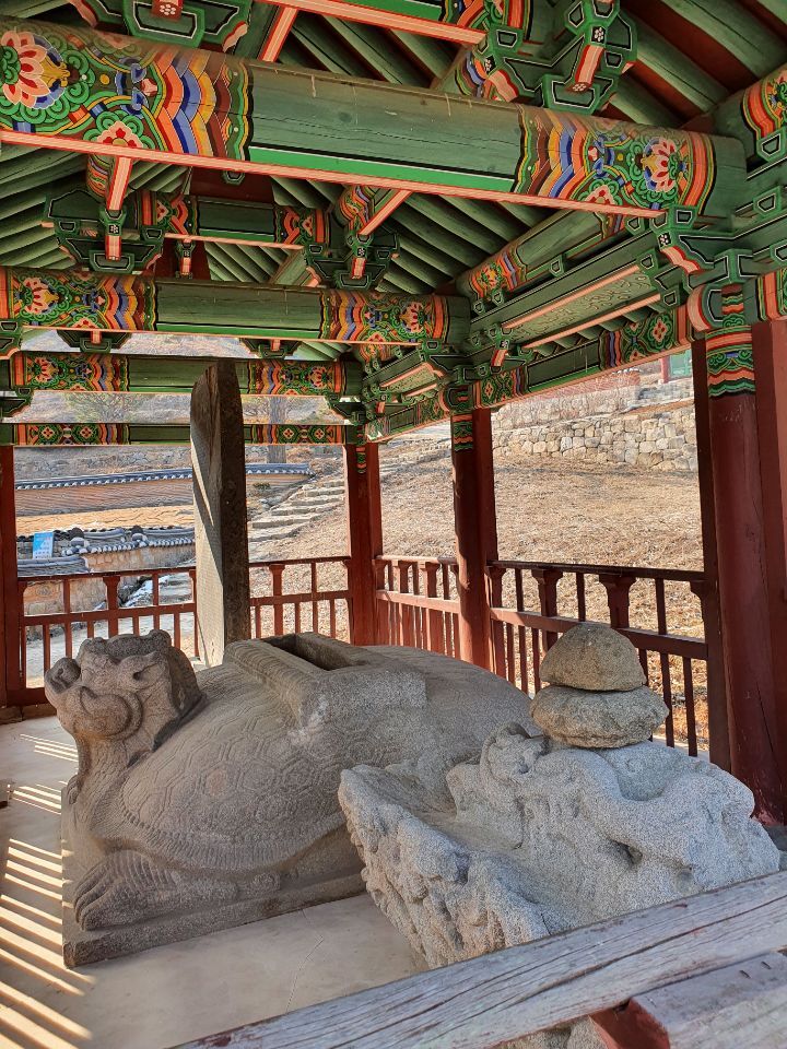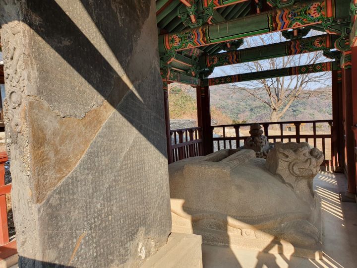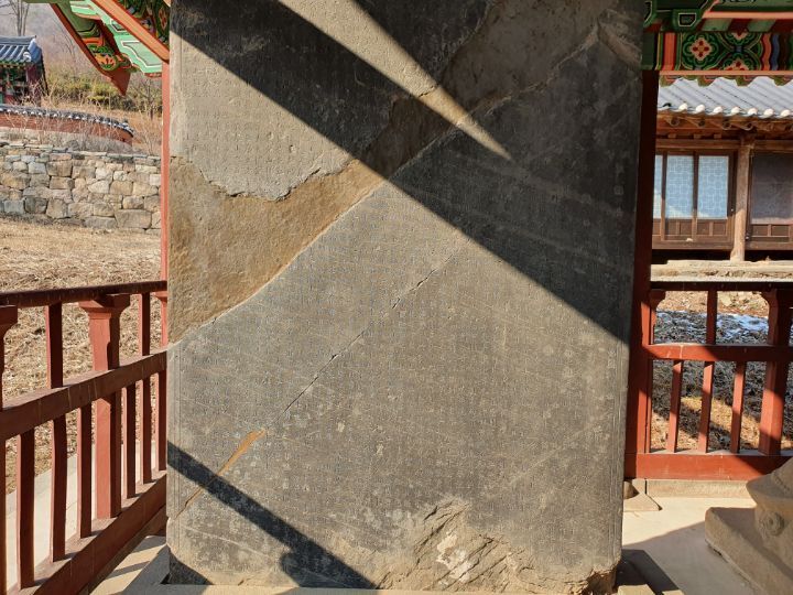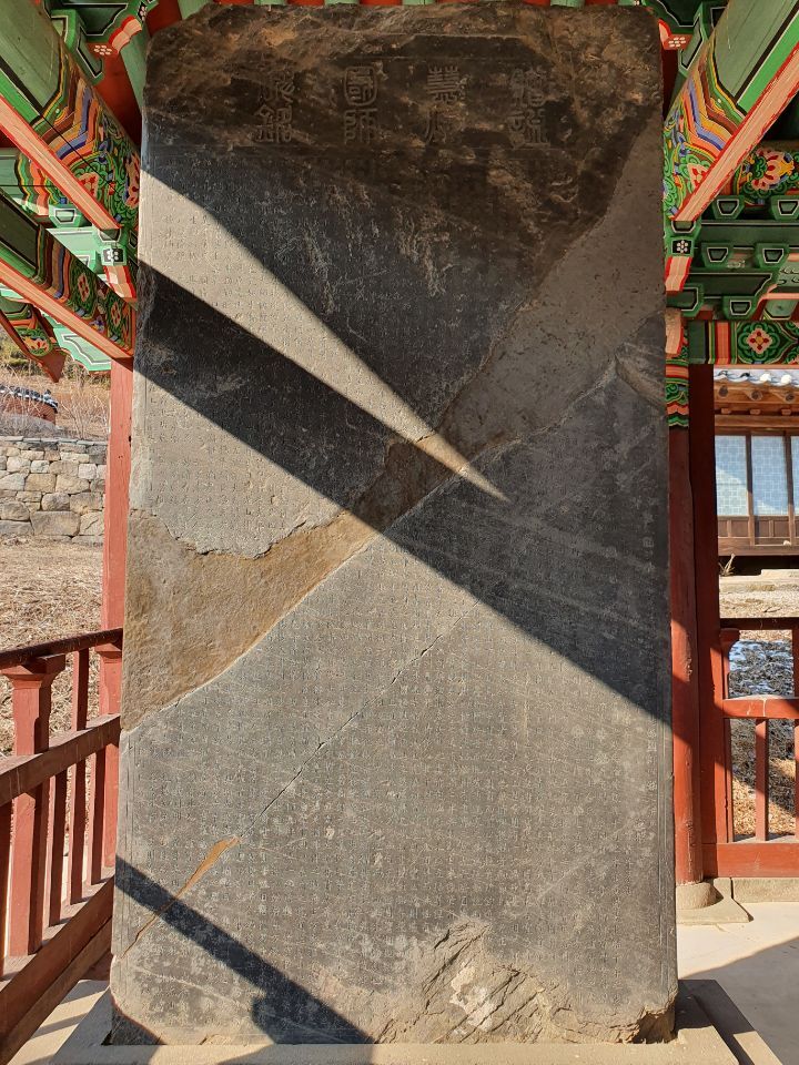 보물 제488호. 1060년(문종 14)에 건립되었다. 현재 비신과 귀부(龜趺)·이수(螭首)를 해체해놓았다. 흑대리석으로 만든 비신에 양측면으로 상하로 길게 쌍룡을 새겨놓았는데, 중단에서 부러져 쓰러져 있으며 좌상부가 결실되었다. 그 밖에 심한 파손은 없고, 글자는 선명한 편이다.