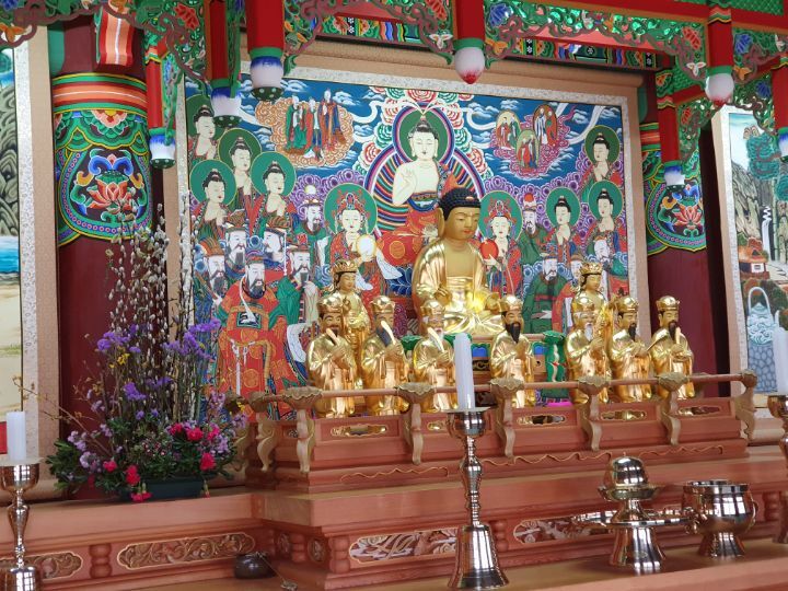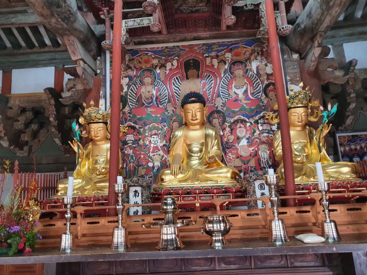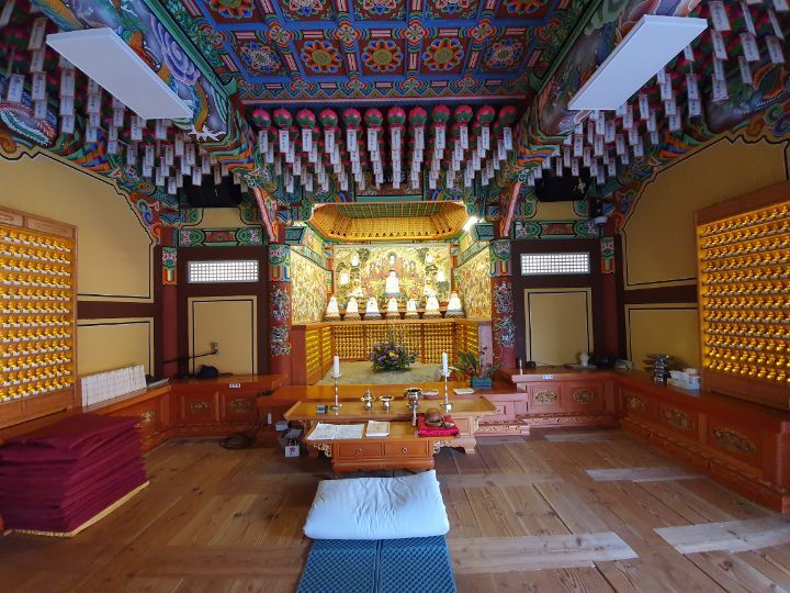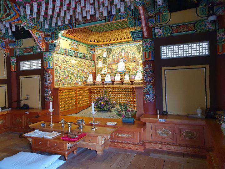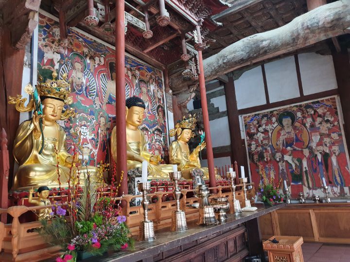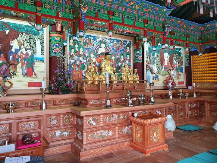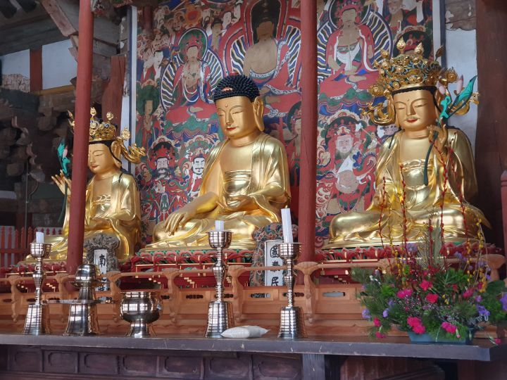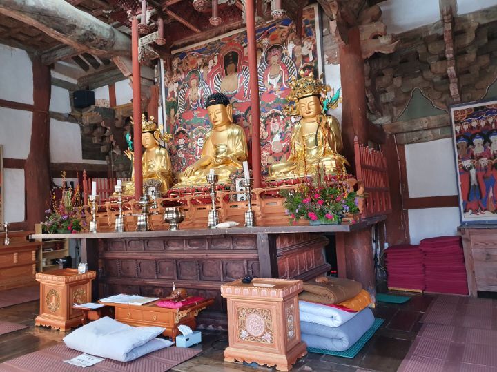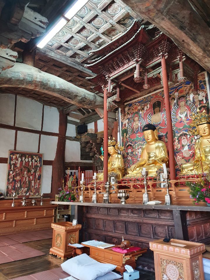 대웅전 내부. 목조석가삼존불좌상이 있다.