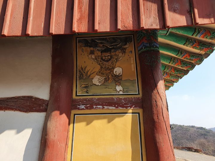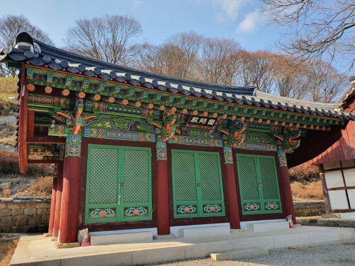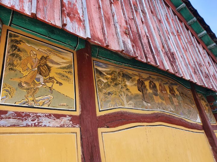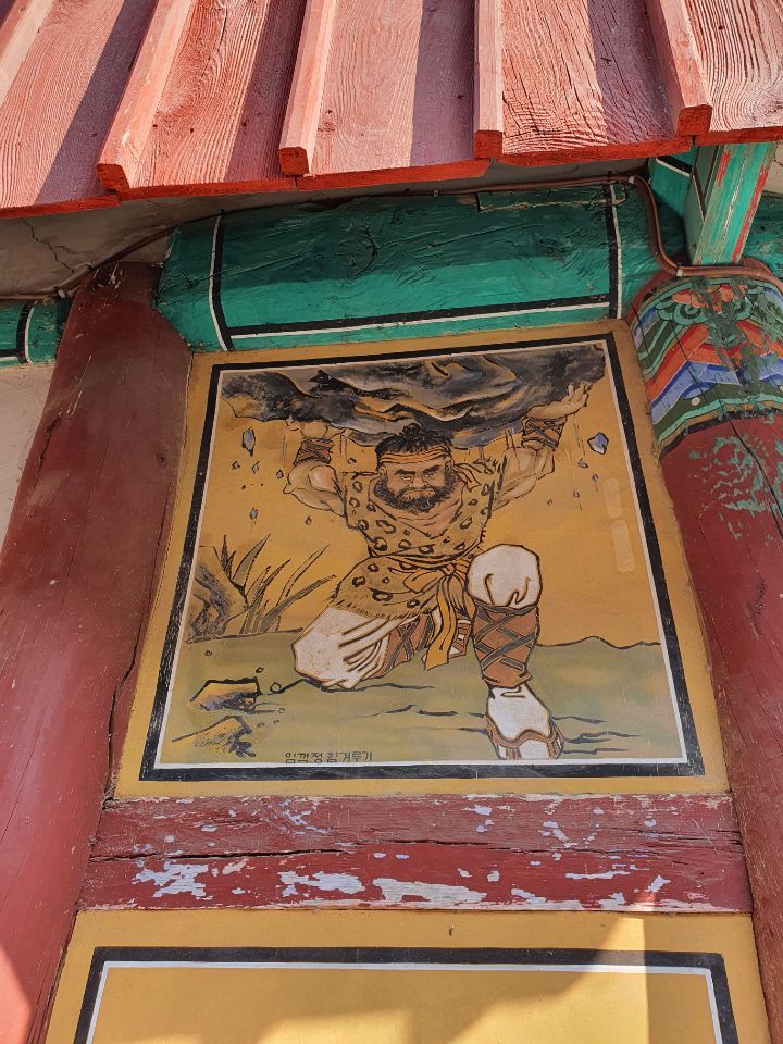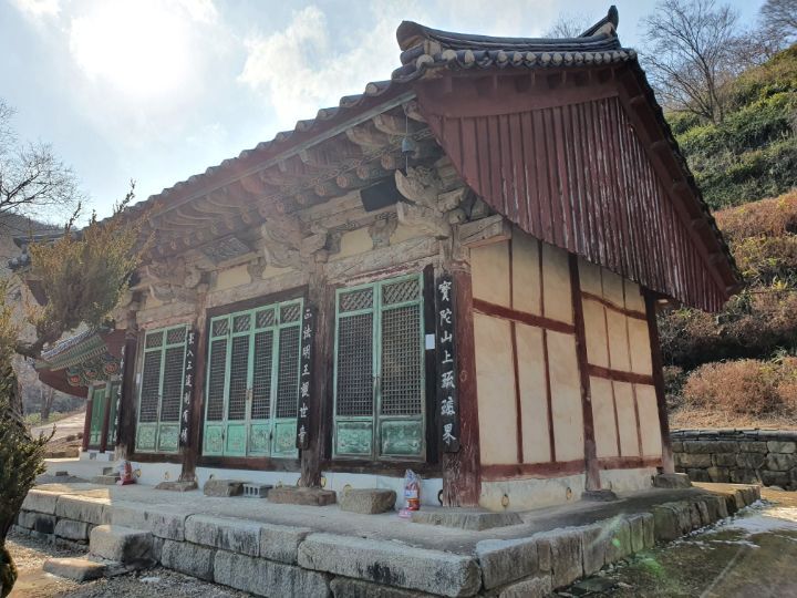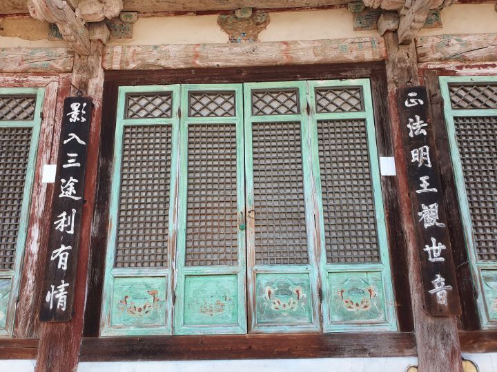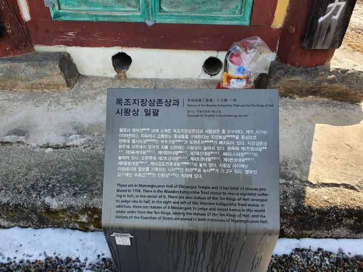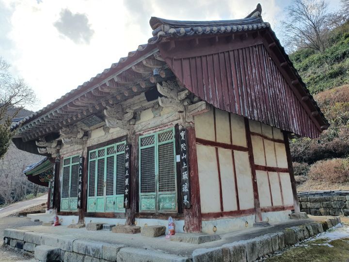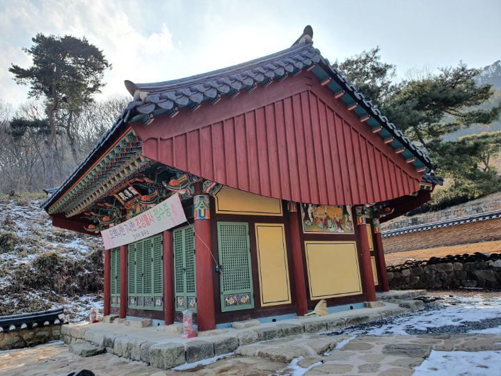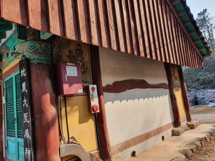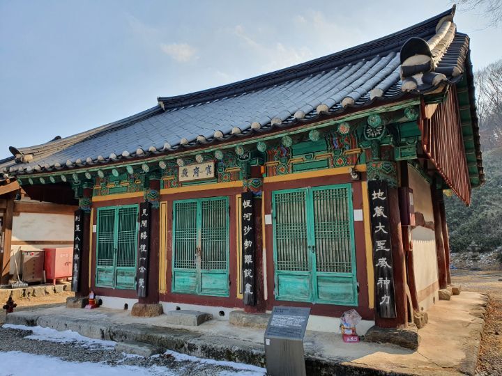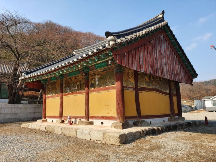명부전. 명부전에는 병해스님과 임꺽정 의형제, 혜소국사와 일곱도적, 궁예 활쏘기 등의 전설이 그림으로 표현되어 있다.