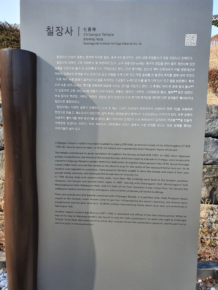 암행어사로 유명한 박문수(朴文秀, 1691-1756)가 꿈속에서 본 시제로 장원급제했다는 ‘몽중등과시(夢中登科詩)’도 칠장사에 전해지는 유명한 이야기다.