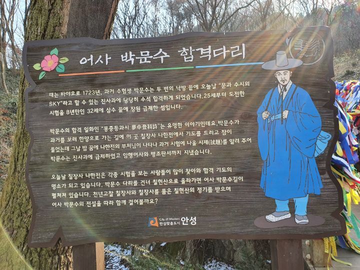 1723년, 박문수가 충청도 천안에서 한양으로 과거 시험을 보러 가는 길에 칠장사에서 하룻밤을 묵었다. 그때 그는 나한전에서 불공을 드리고 잠을 잤는데 나한이 꿈에 나타나 시제를 알려주었다고 한다. 놀랍게도 시험에서 같은 시제가 나왔고 박문수는 삼수 끝에 장원에 급제할 수 있었다. 그날 밤, 박문수가 칠장사에 묵지 않았다면 조선 최고의 암행어사는 존재하지 않았을지도 모른다. 이 이야기가 바탕이 되어 어사 박문수 합격다리와 칠장산 어사 박문수길이 조성되었다.