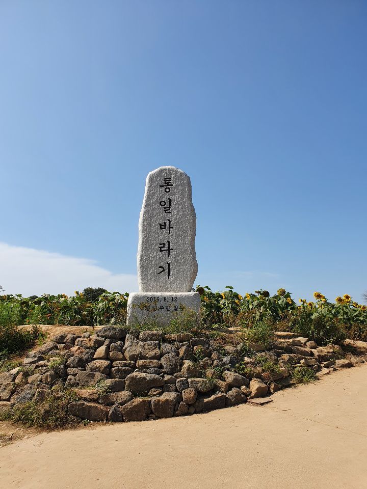 아름답고 의미 깊은 성에 또 하나의 의미와 아름다움을 더한다. 해를 바라는 것은 통일을 바라는 것, 해바라기가 통일 바라기가 된다. 호로고루성 입구에 세운 마을사람들의 망부석같은 비석이다.
