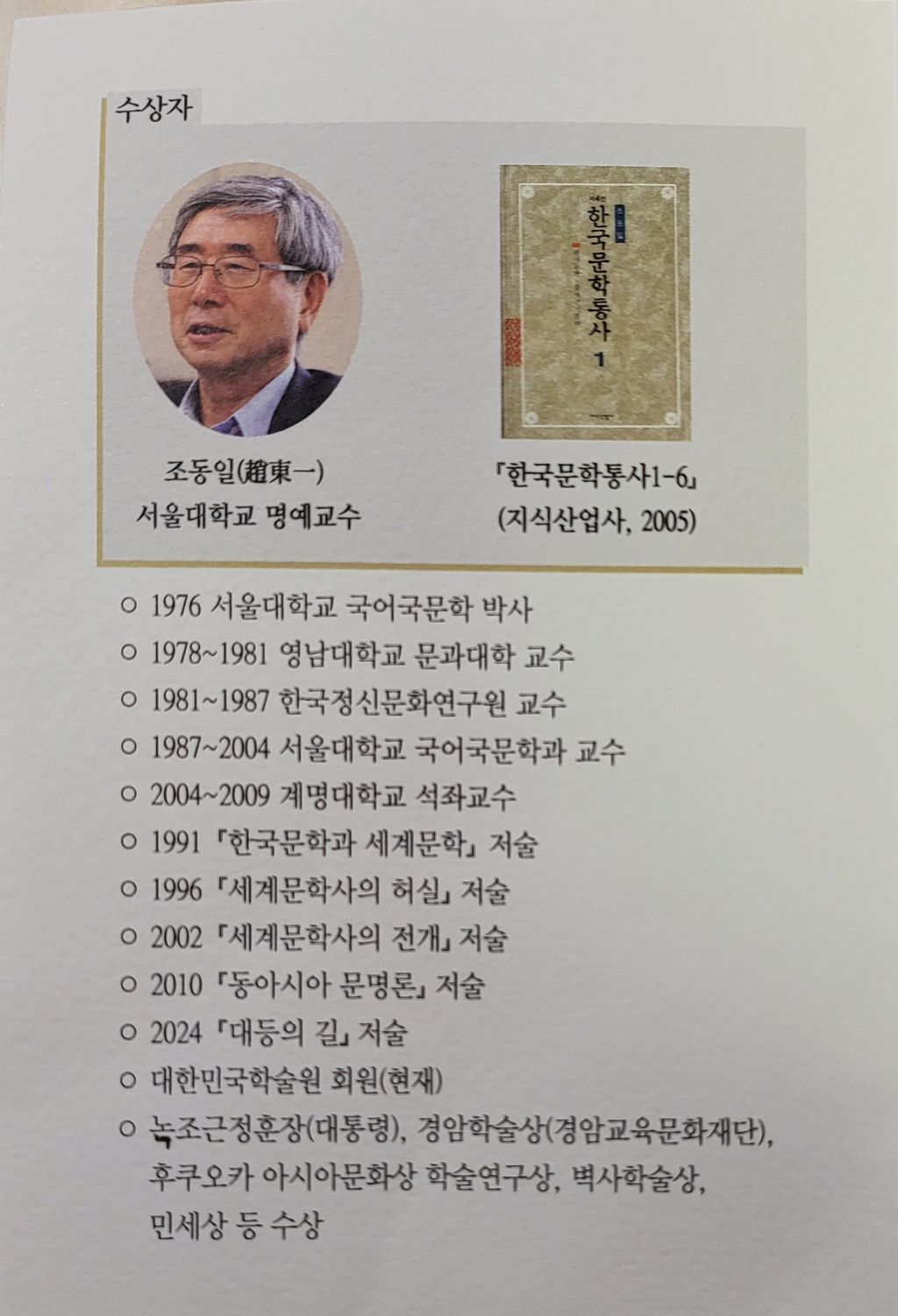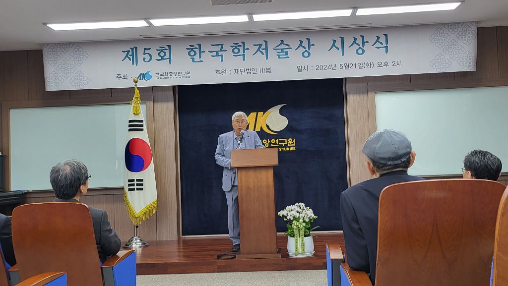 2024.5.21.에는 제5회 한국학저술상 시상식이 있었다. 수상자인 조동일 교수는 이곳 한국학중앙연구원 교수로 한동안 재직하면서 <한국구비문학대계>의 편찬을 주관한 바 있는 터라 이 기관과 여러 모로 높은 인연을 보여주었다. 특히 『한국문학통사』집필 과정 중에 재직하면서 한국학대학원 학생들과 원고 검토 와 수업을 하면서 집필에 도움을 받았음을 수상소감에서 밝혀 본 기관이 한국학 연구에 얼마나 실제적으로 기여하고 있는지를 알렸다.