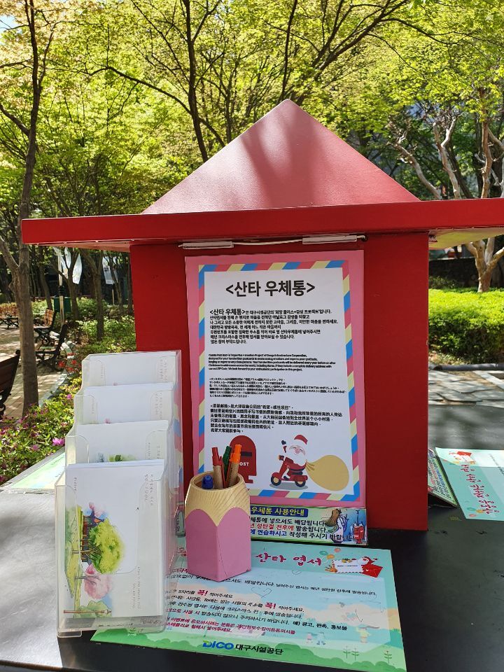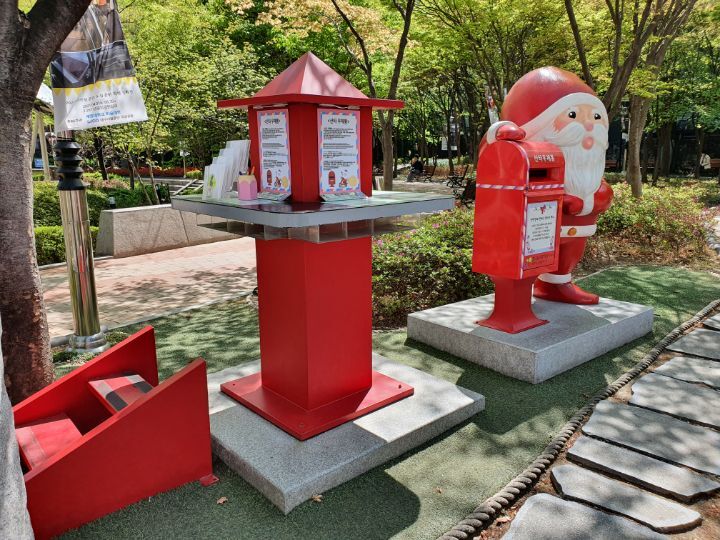 산타우체통이 만들어져 있다. 핀란드 끝 산타발상지 로바니에미에 만들어 놓은 산타 우체국 생각이 난다. 한국에도 화천이 로바니에미 시에서 독점권을 받아 핀란드 산타우체국 한국본점으로 2018년에 문을 열었다. 꿈을 꿀 수 있는 통로를 만드는 것은 좋은 일이다. 재미있는 아이디어다.