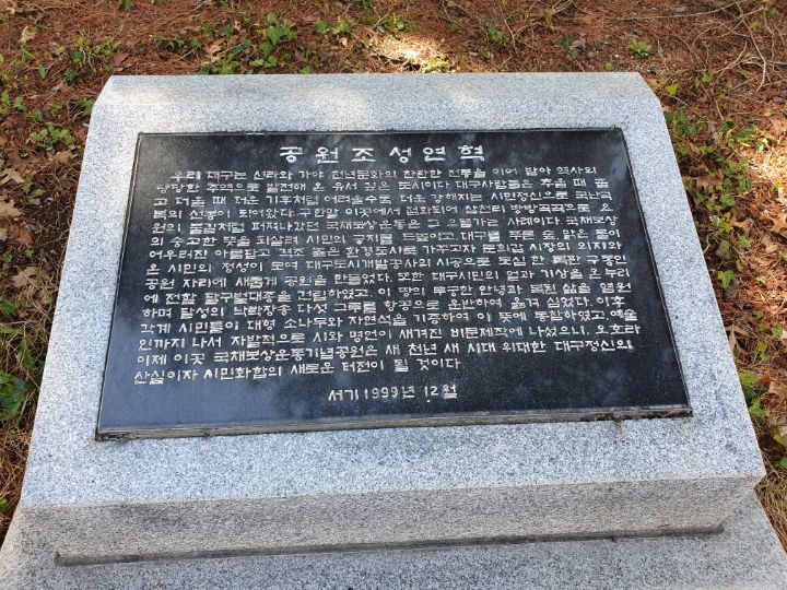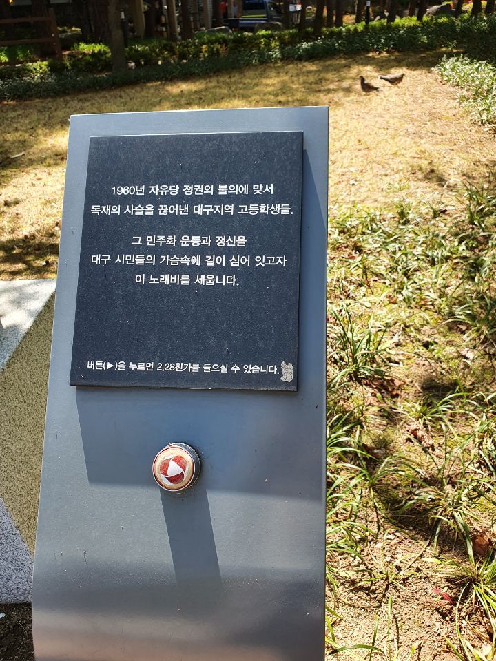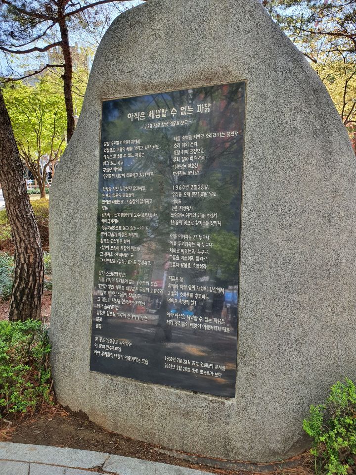 대구도 4.19 전에 2.28 학생민주의거가 있었고, 일제 식민지 시절에는 국채보상운동의 중심으로서 항일운동의 중추를 담당했었다. 여기까지는 비슷하다. 그러나 지금 대구는 보수의 성역이 되어 광주와 전혀 다른 길을 걷고 있다. 이 공원에 오면 항상 낯설게 여겨지는 이유다. 역사는 돌고 도니 언젠가 대구도 민주화를 위한 영남의 거점이 될 거라고 생각한다.