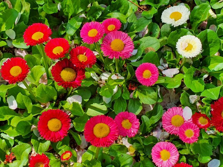 눈이 부신 햇빛에 눈이 부신 갖가지 빛깔의 꽃들이 제색을 자랑한다.