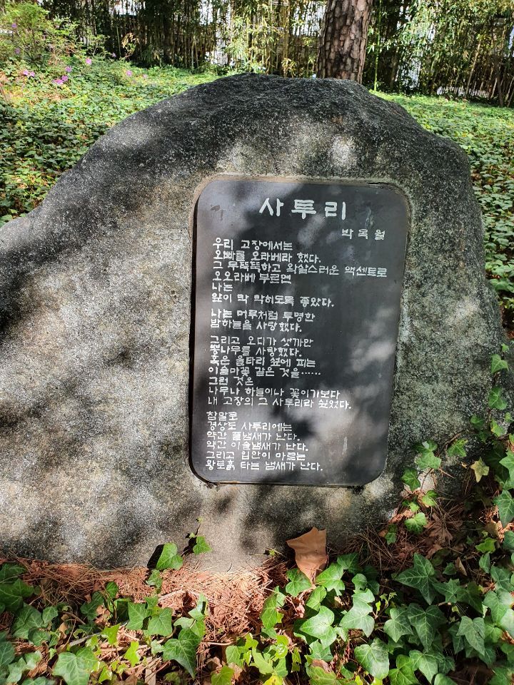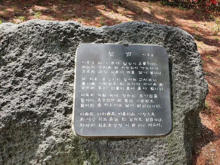 시비길. 여러 시들이 바위에 적혀 있다. 바위 시들이 처음에는 촌스럽고, 뭔가 어색하다는 생각을 했는데, 이렇게라도 한번이라도 더 독자에게 다가가면 좋은 거 아니겠느냐는 생각으로 바뀌었다.