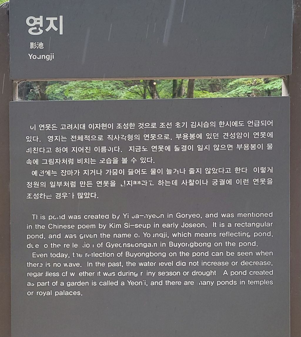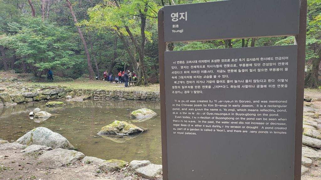 영지는 청평사 뒤의 오봉산이 비치도록 되어 있으며, 연못 가운데 세 개의 큰 돌이 있고, 그 사이에 갈대를 심어 단순하면서도 아름답게 꾸몄다. (한국민족문화대백과사전 전재)