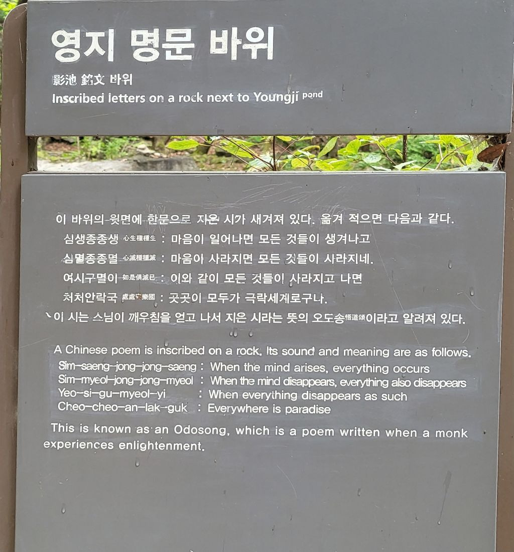또, 구성폭포에서 식암에 이르는 2㎞ 9,000여 평의 방대한 지역에는 계곡을 따라 주변의 자연 경관을 최대한으로 살려 수로를 만들고, 계곡의 물을 자연스럽게 정원 안으로 끌어들여 영지에 연결시켰으며 주위에 정자와 암자 등을 세우는 등, 자연의 섭리에 순응하여 선(禪)을 익히는 정신수양의 도량으로 짜임새 있게 가꾸어졌음이 밝혀졌다.