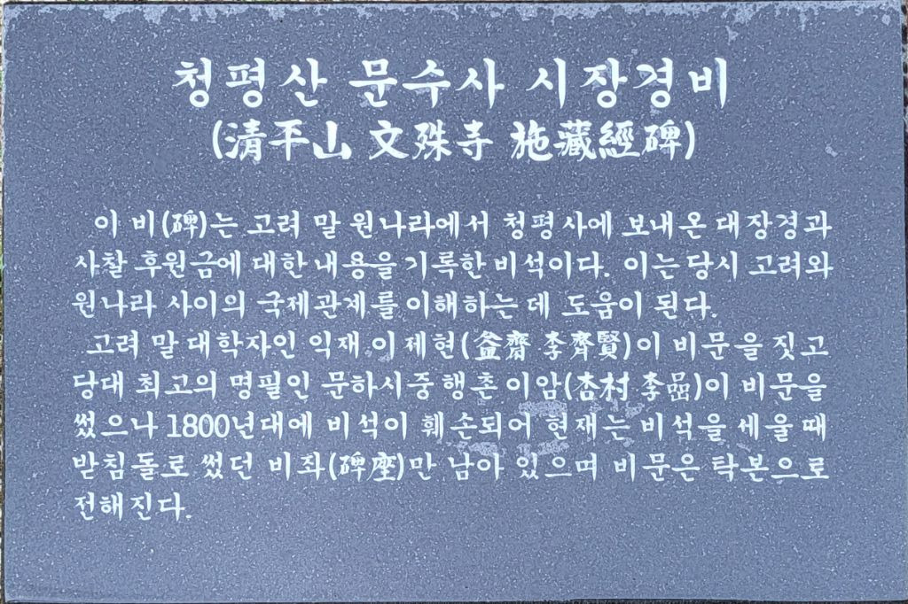 그곳에서 다시 2㎞ 떨어진 상류에서는 이 정원을 만든 이자현이 새긴 ‘청평식암(淸平息菴)’이라는 각자(刻字)가 발견되어 기록상에 나타나 있는 영지 중심의 대규모 고려 정원임이 확인되었다.
