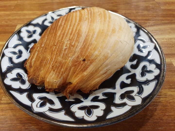 삼사, 일명 고기빵. 1개 4,000원. 크롸상같이 파이빵 안에 고기가 들어 있다. 빵이 달지 않고 부드러워 의외로 고기와 잘 어울린다. 우즈베키스탄 대표음식이다.