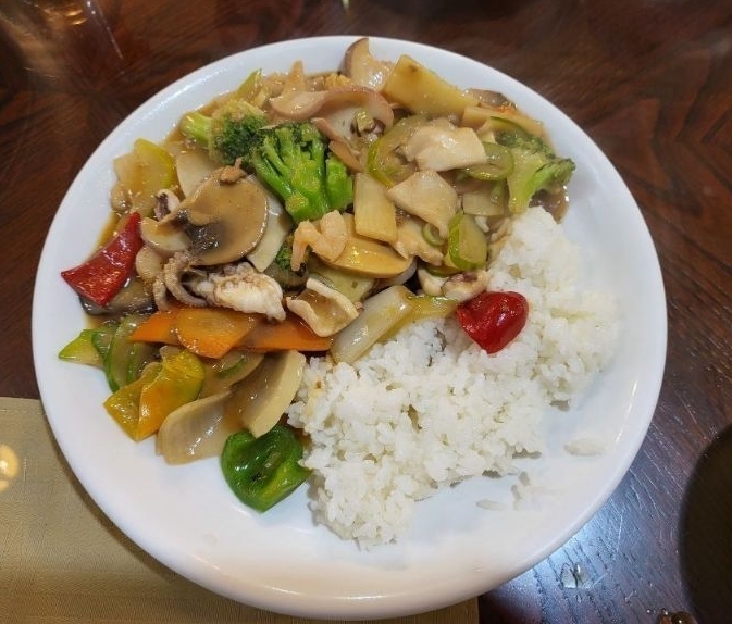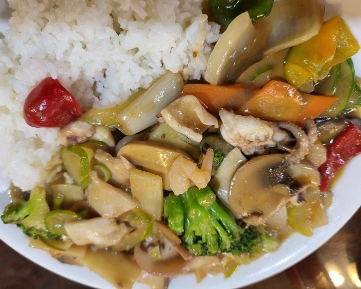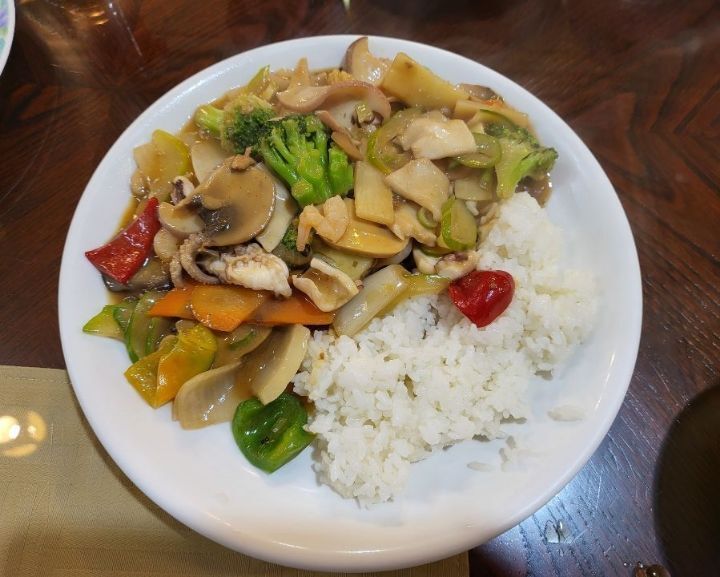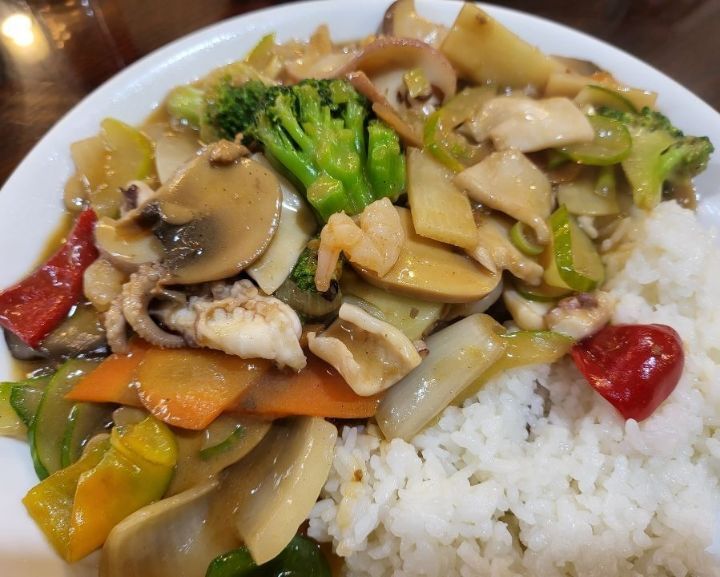 해물잡탕밥, 해물과 야채가 풍성하게 들어 있다.