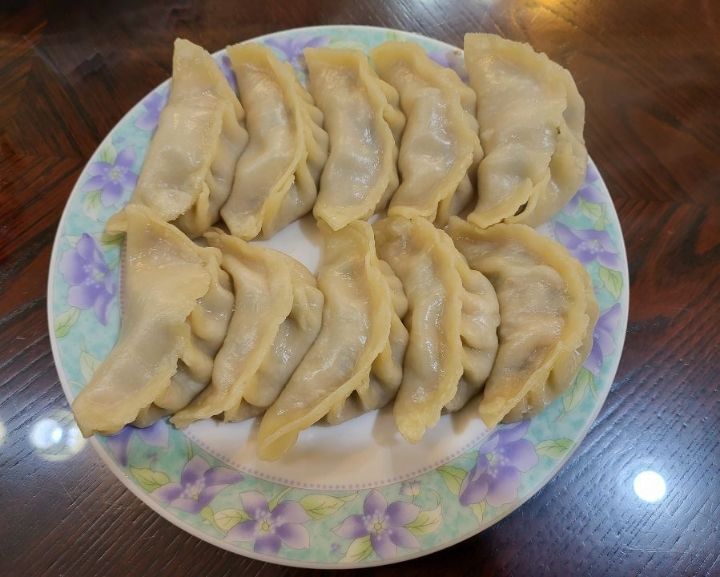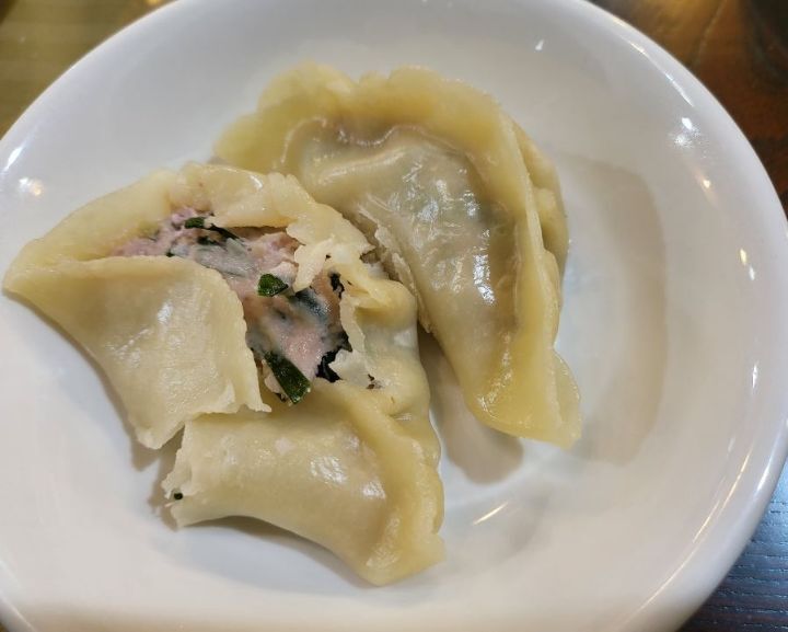 물만두. 한눈에 두텁고 쫄깃한 만두피의 식감이 느껴진다. 속은 육즙은 별로 없지만 향긋하고 진한 맛이다. 느끼하지 않으면서 부드러운 만두소와 피가 잘 어우러진다.