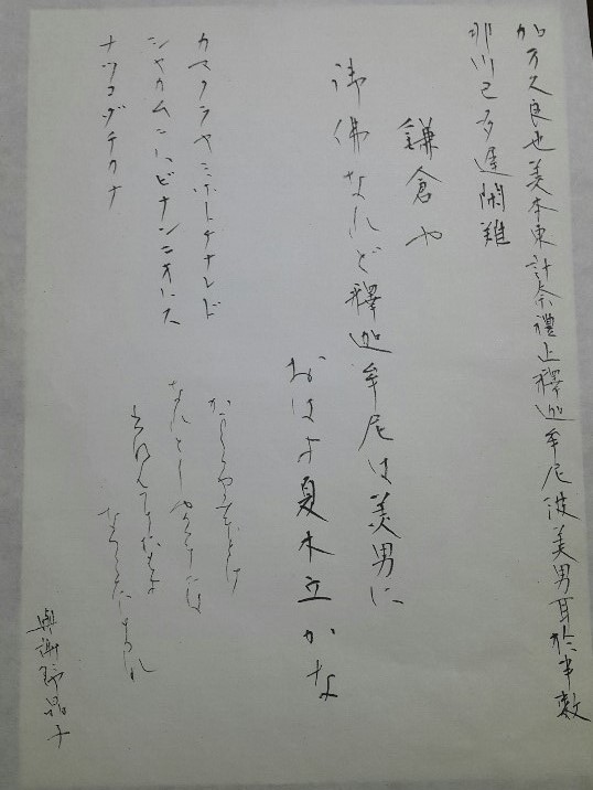 일본에서 유학을 하며 로타리 장학금을 받다가 알게 된 일본인서예선생님이 있다. 일본의 붓글씨는 여리고 섬세한데 그 안에 심지도 있고 뜻도 담아내야 하기에 선의 아름다움이라고도 할 수 있다. 먹의 색깔에서도 글씨의 표정을 나타낼 수 있다. 선생님은 1932년생으로 처음에는 음악을 듣고 미술관을 따라다니다 나중에는 서예를 배우게 되었다.