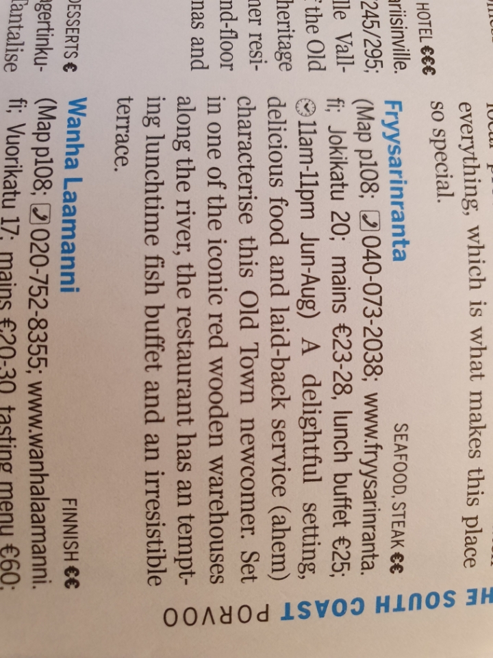 핀란드 생선요리를 환상적인 분위기 속에서 맛볼 수 있다. 포르보 맛집으로는 가장 널리 알려진 집, 로니플라넷에 소개한 그 분위기, 그 값에 지금도 성업중이다. 식사 시간이 조금 지나면 기나긴 줄이 늘어서 언제 입장할지 모르니 서둘러야 한다.