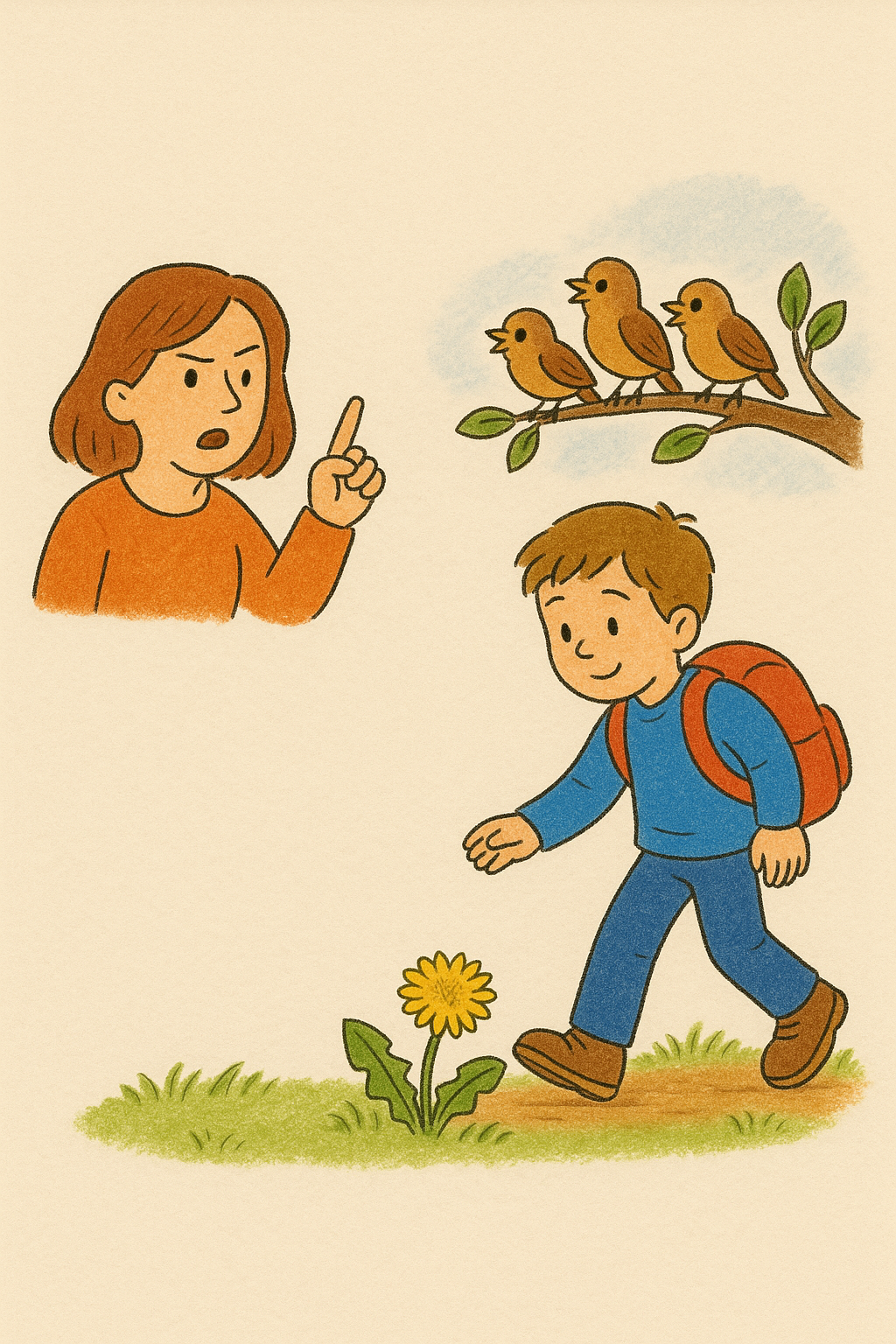 Through simple, repetitive lines and friendly dialogue with sparrows and a dandelion, the poem reflects a world where even the smallest parts of nature become companions and voices of curiosity.
