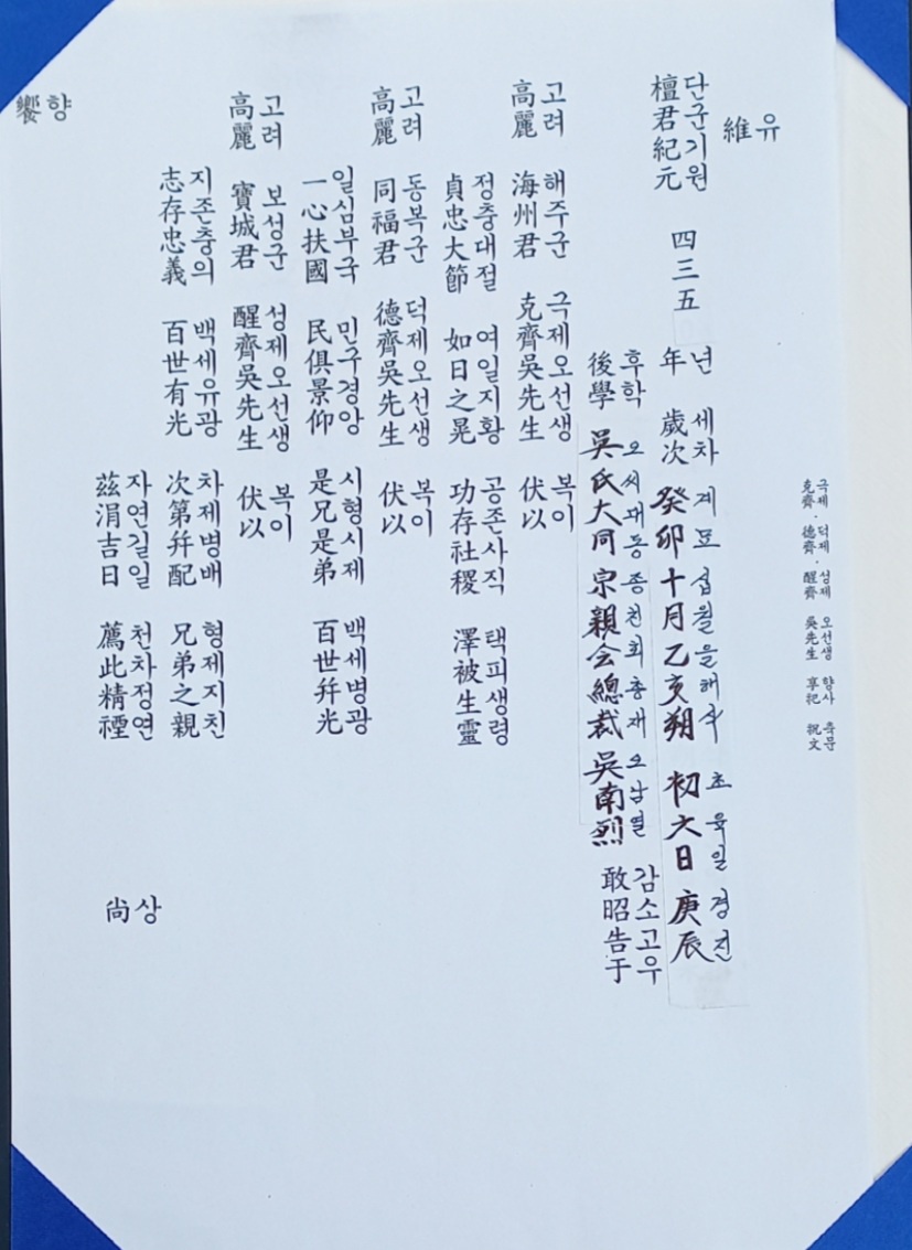 공주 유림 집도를 위시해 초헌관 오남열총재 아헌관 오유근 고문 종헌관 오현진 설단 추진위원장 집례 오병일 미산파 회장 님께서 긴 시간에거쳐 정성으로 제를 올렸습니다.