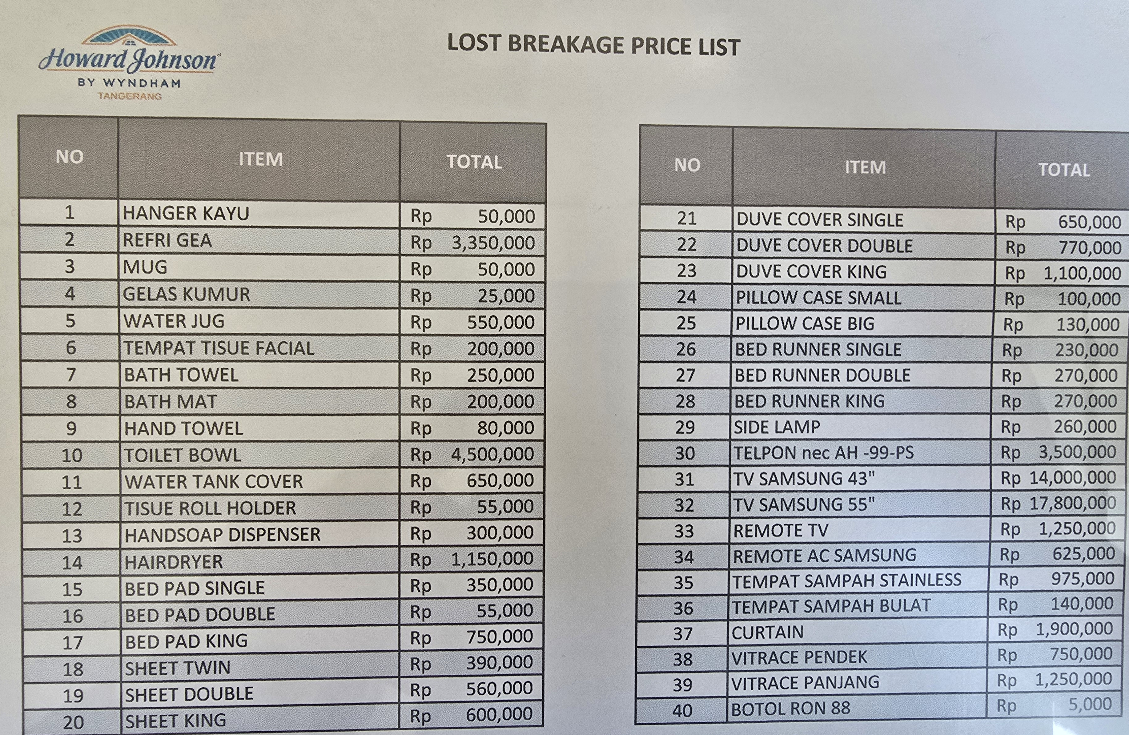 내역에는 그저 파손에 분실에 대한 부분으로 금액을 청구했다. 이 금액을 청구할 때까지 어떤 내역이 얼마인지 보여준 적도 없다. 결국은 결제를 하고 나서 내역을 보여달라고 하니 보여주는데 그 또한 별 거지같은 요구를 다 한다는 식으로 표정을 짓고는 보여주는 것이다. 솔직히 인도네시아 소득 수준으로 보면 이 금액이 적지않은 것이 사실이지만 한국인들에게는 2만원 정도의 금액으로 속이 쓰리기는 하지만 터무니없는 금액으로 치부되지는 않는다. 결국은 태도와 서비스 수준의 문제인 것이다.